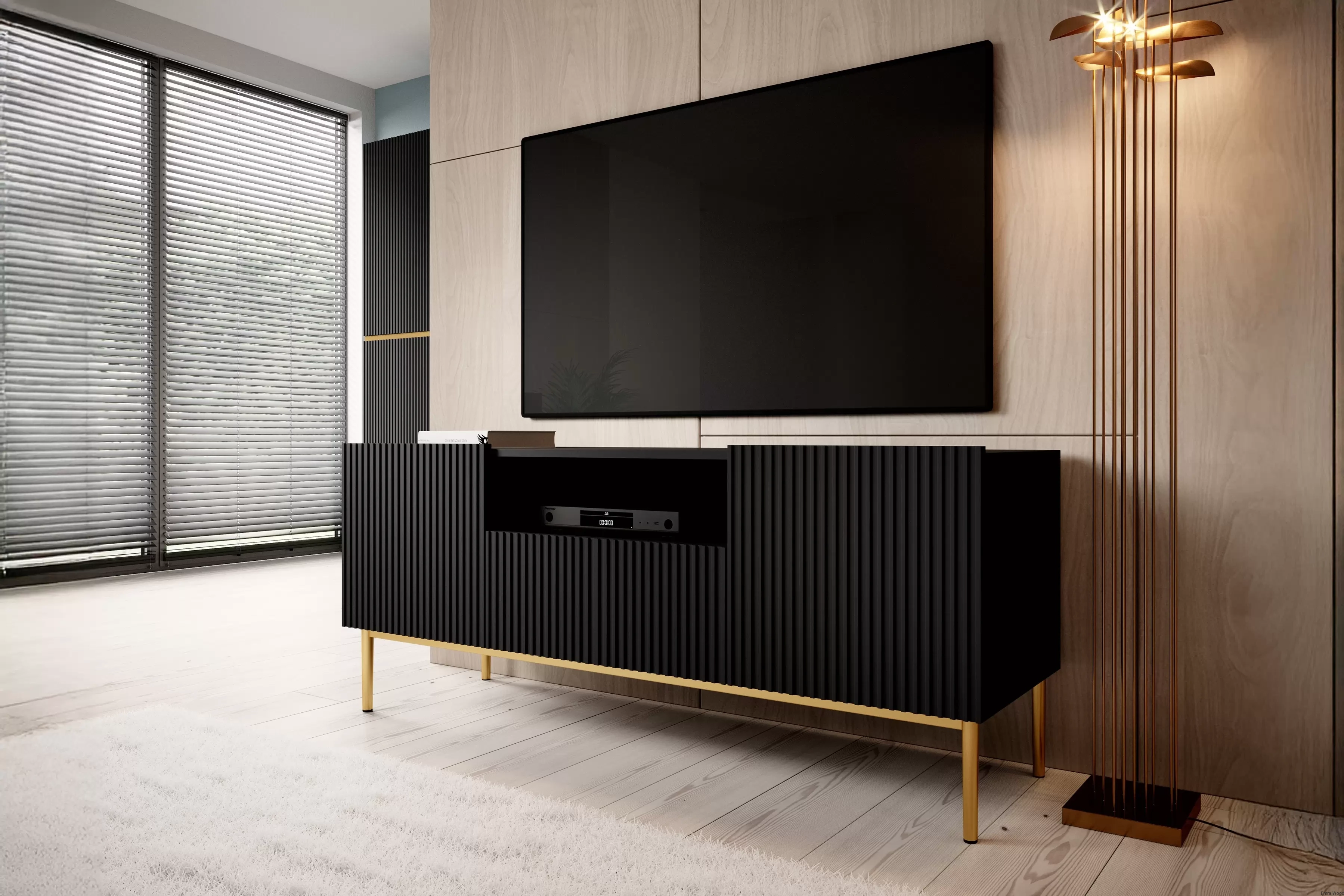 Chcesz nadać swojemu salonowi wyrafinowanego stylu z nutą nowoczesności? Szafka RTV Nicole 150 cm z szufladą i wnęką - czarny mat / złote nóżki to idealne rozwiązanie dla Ciebie.