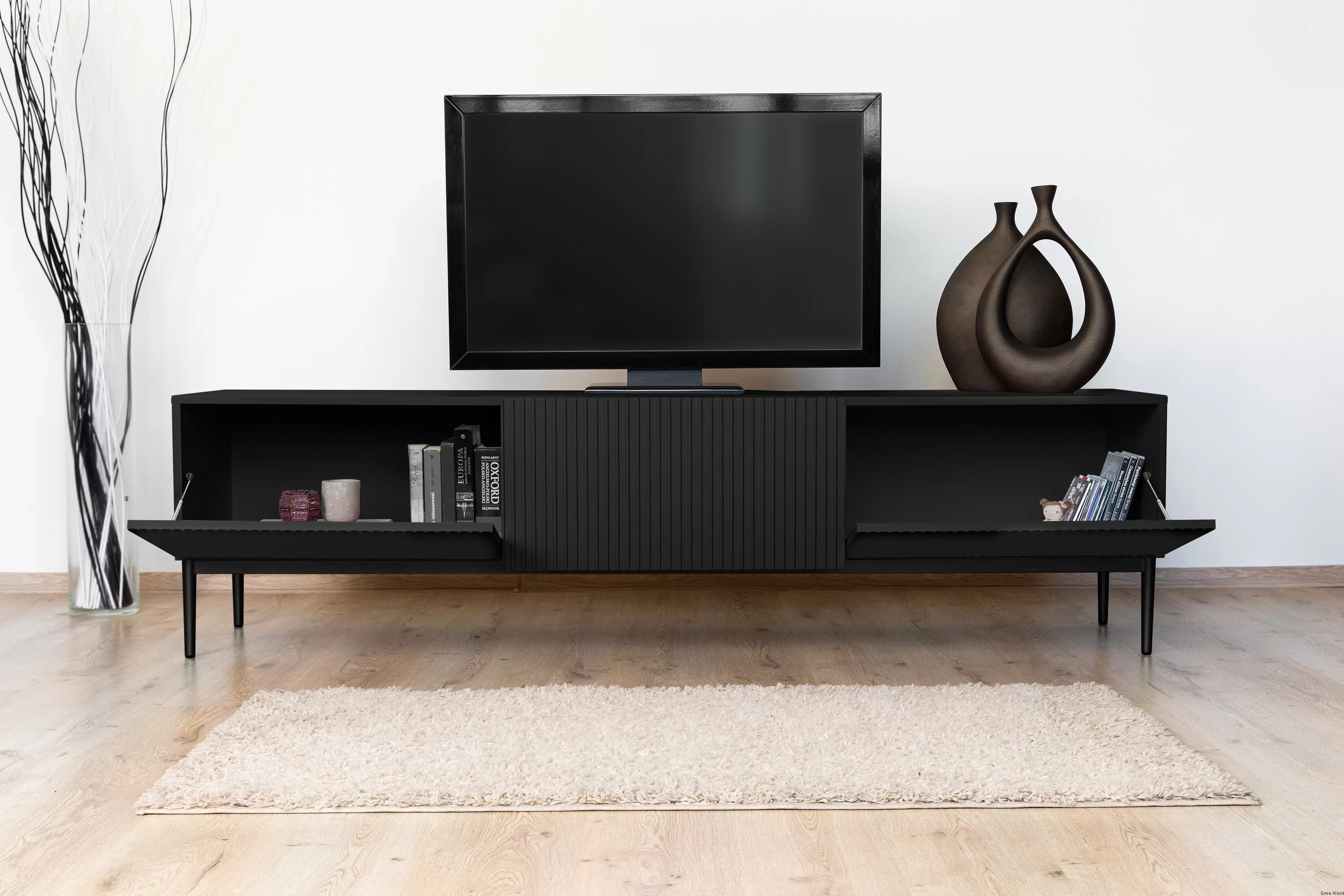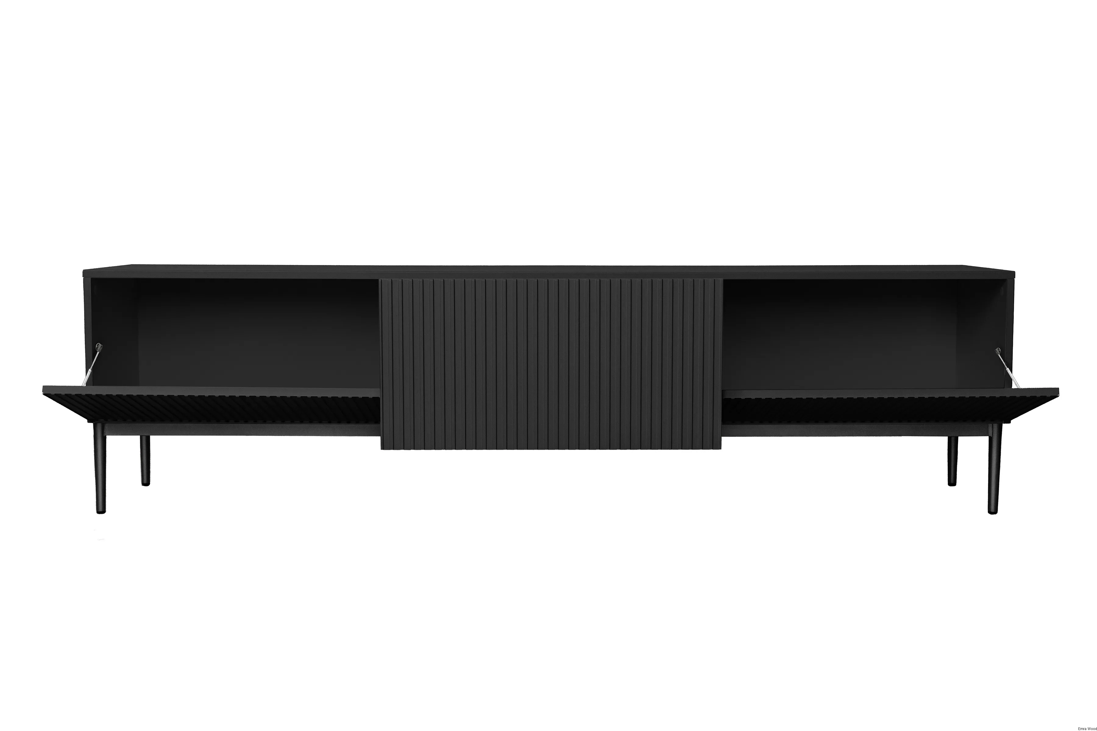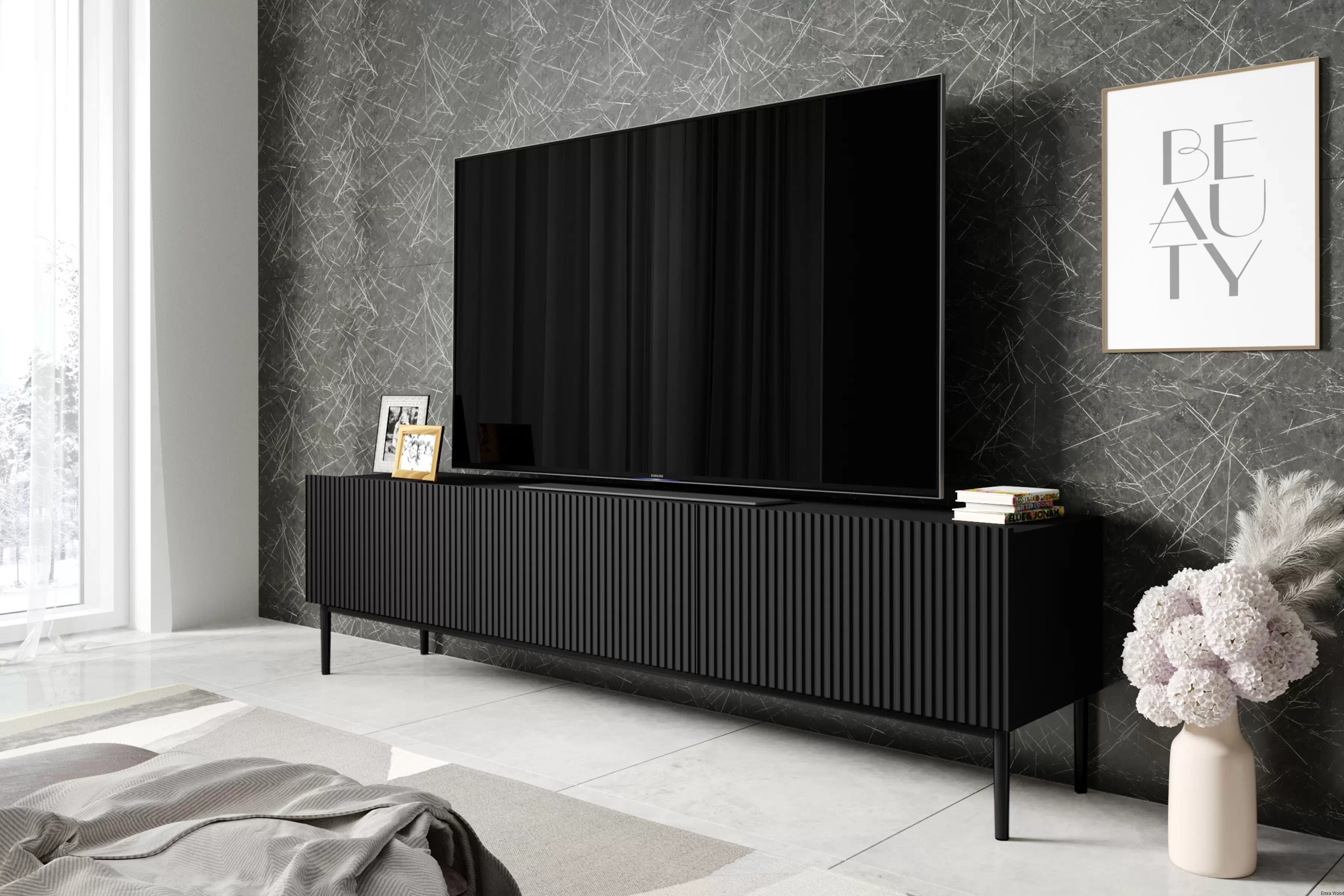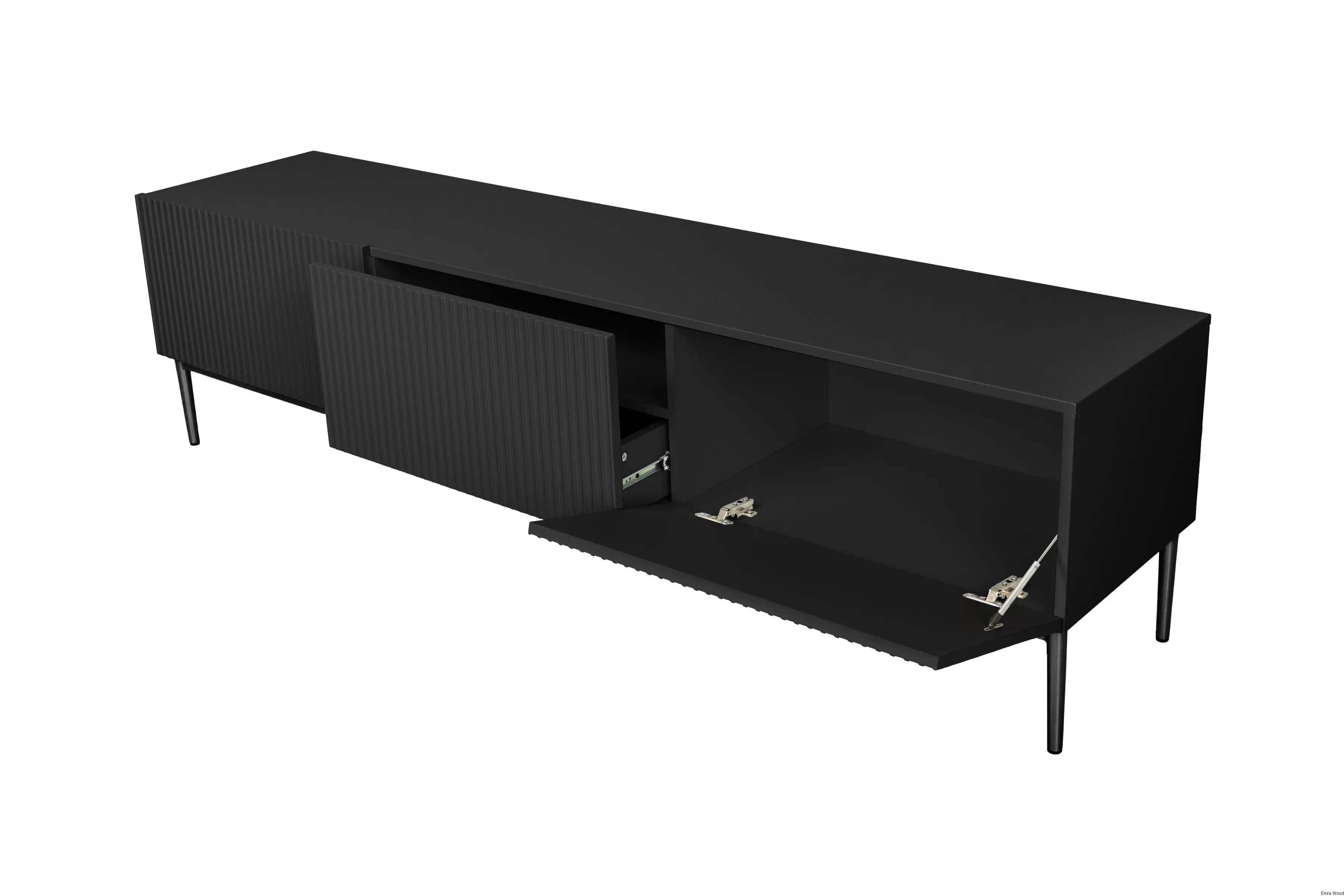 Czy szukasz mebla, który spełni wszystkie Twoje oczekiwania? Szafka RTV Nicole z ryflowanym frontem i szufladą 200 cm - czarny mat / czarne nóżki, to wszystko, czego potrzebujesz!