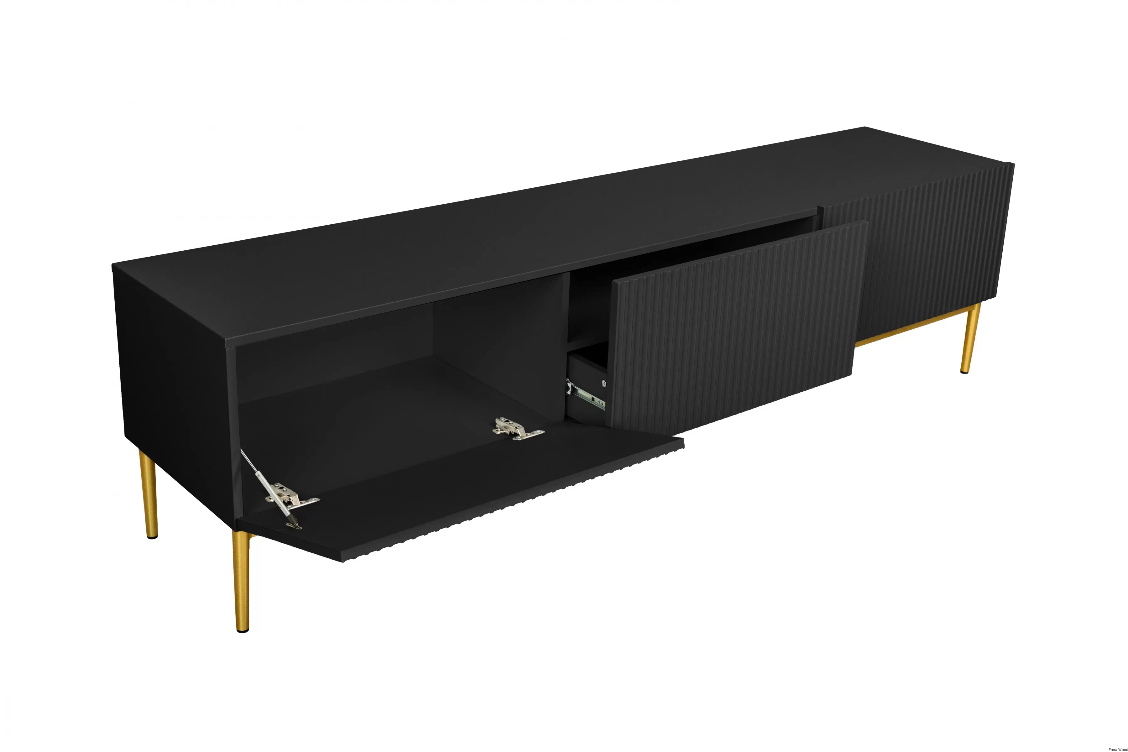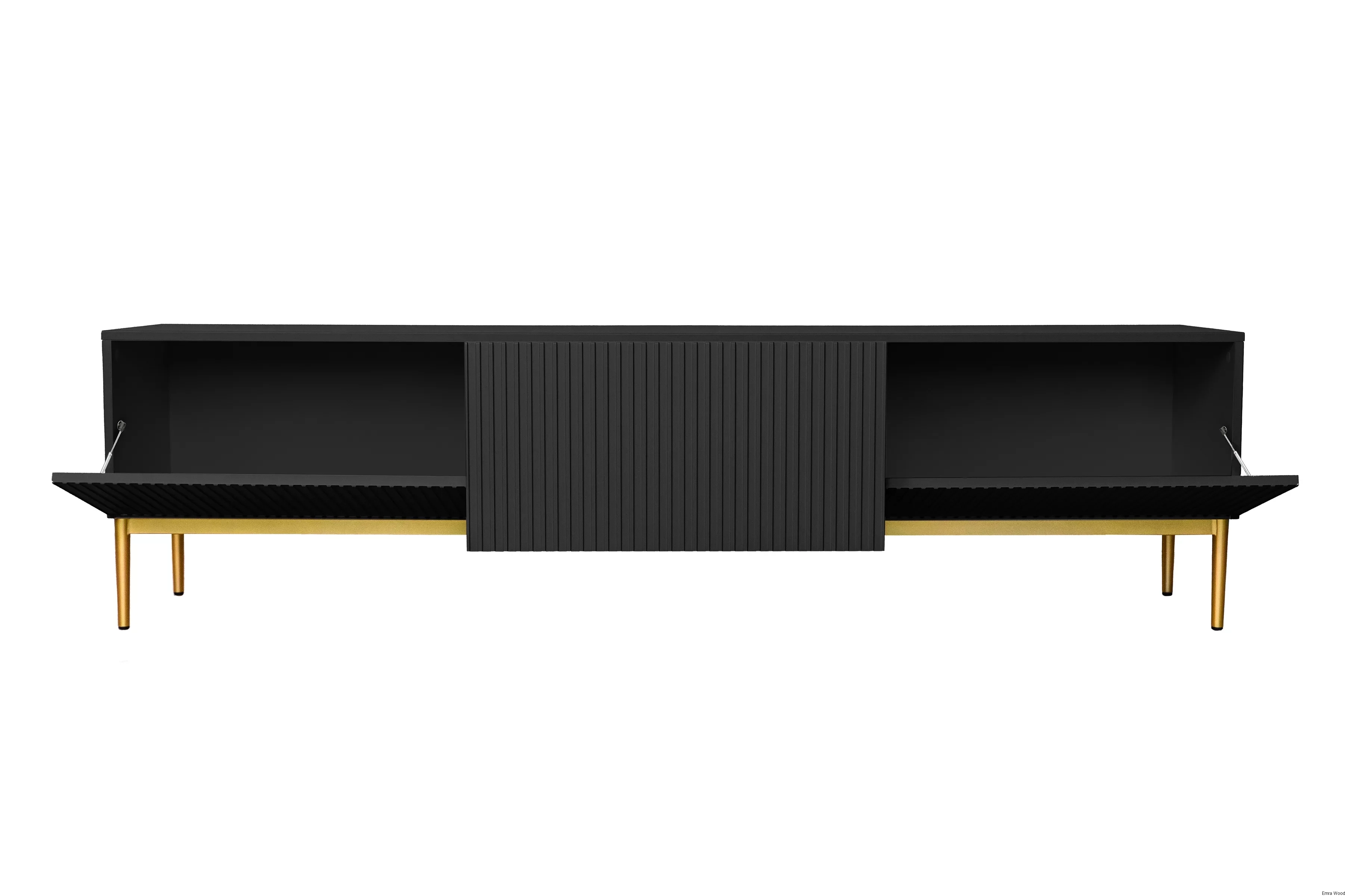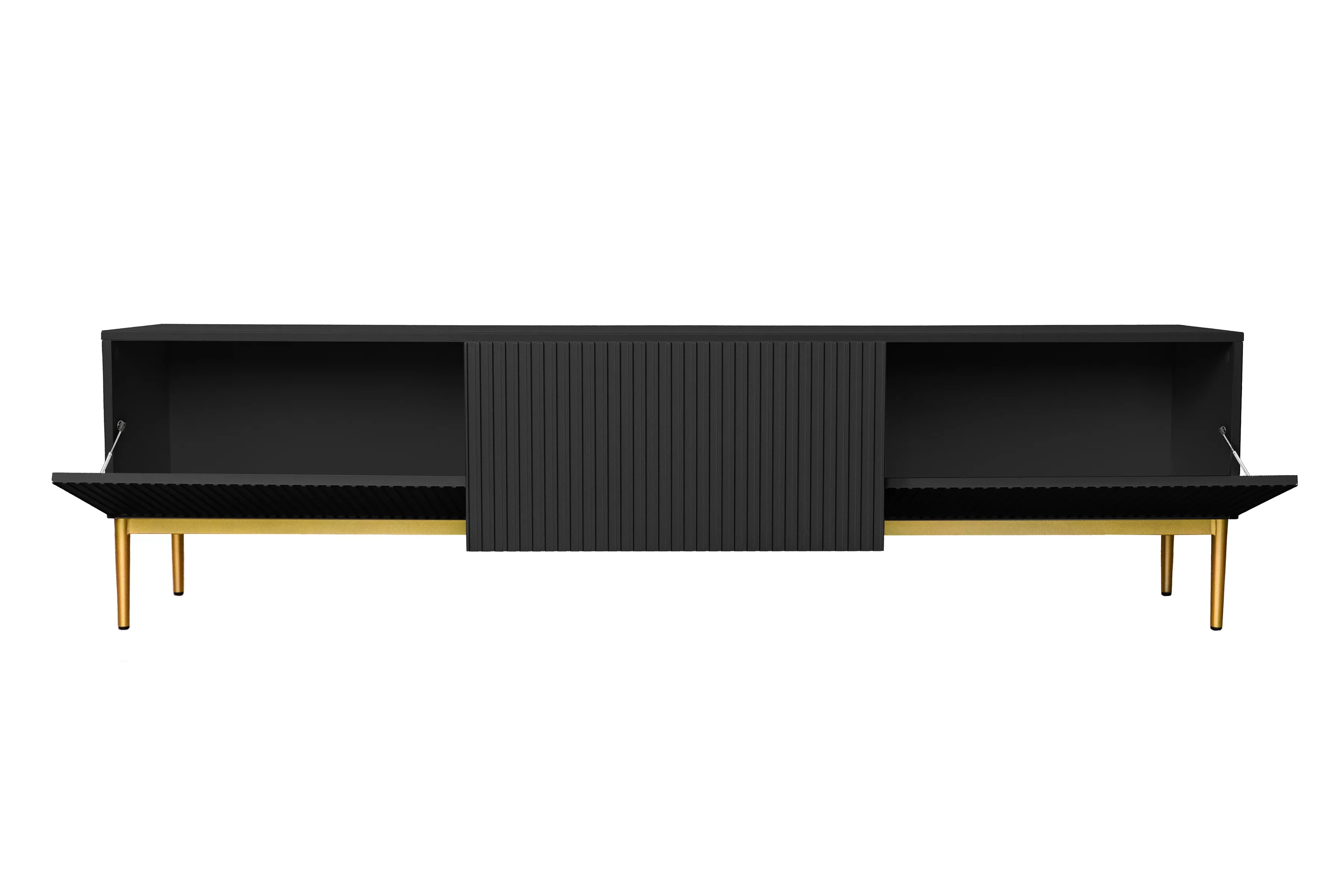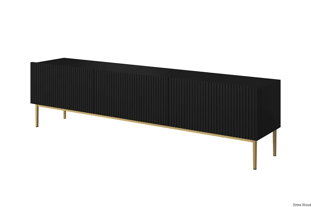 Złote metalowe nogi kontrastują z czarnym matowym frontem, tworząc efektowne połączenie, które wprowadzi do Twojego wnętrza nutę elegancji i luksusu. Ryflowane fronty dodają meblom charakteru i osobowości. Ich struktura tworzy interesujący wizualny efekt, który z pewnością przyciągnie wzrok każdego gościa.