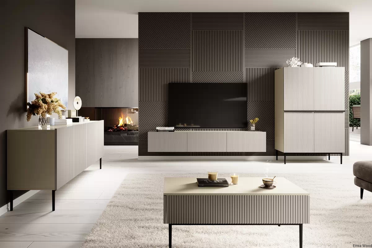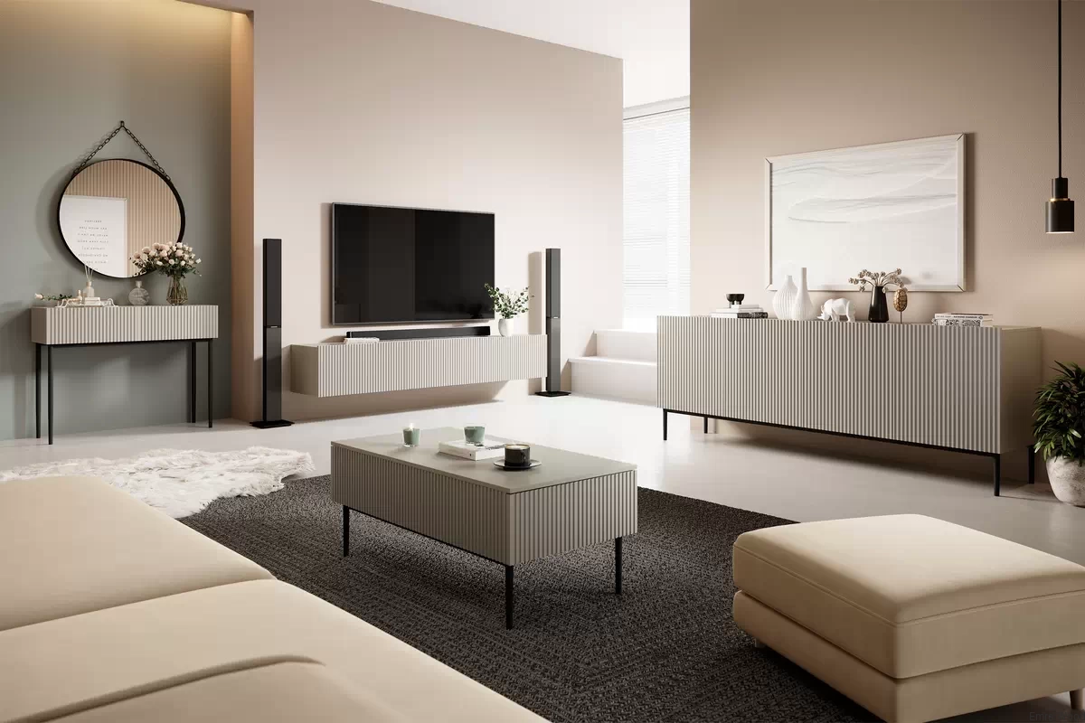 Wyobraź sobie, jak ten mebel odmienia przestrzeń Twojego salonu. Jego kolor kaszmiru, zarówno na froncie, jak i korpusie, doda wnętrzu wyrafinowania i klasy. Ryflowane fronty dodają meblowi niepowtarzalnego charakteru i osobowości. To wyjątkowy dodatek, który przyciąga wzrok i sprawia, że mebel staje się centralnym punktem aranżacji.