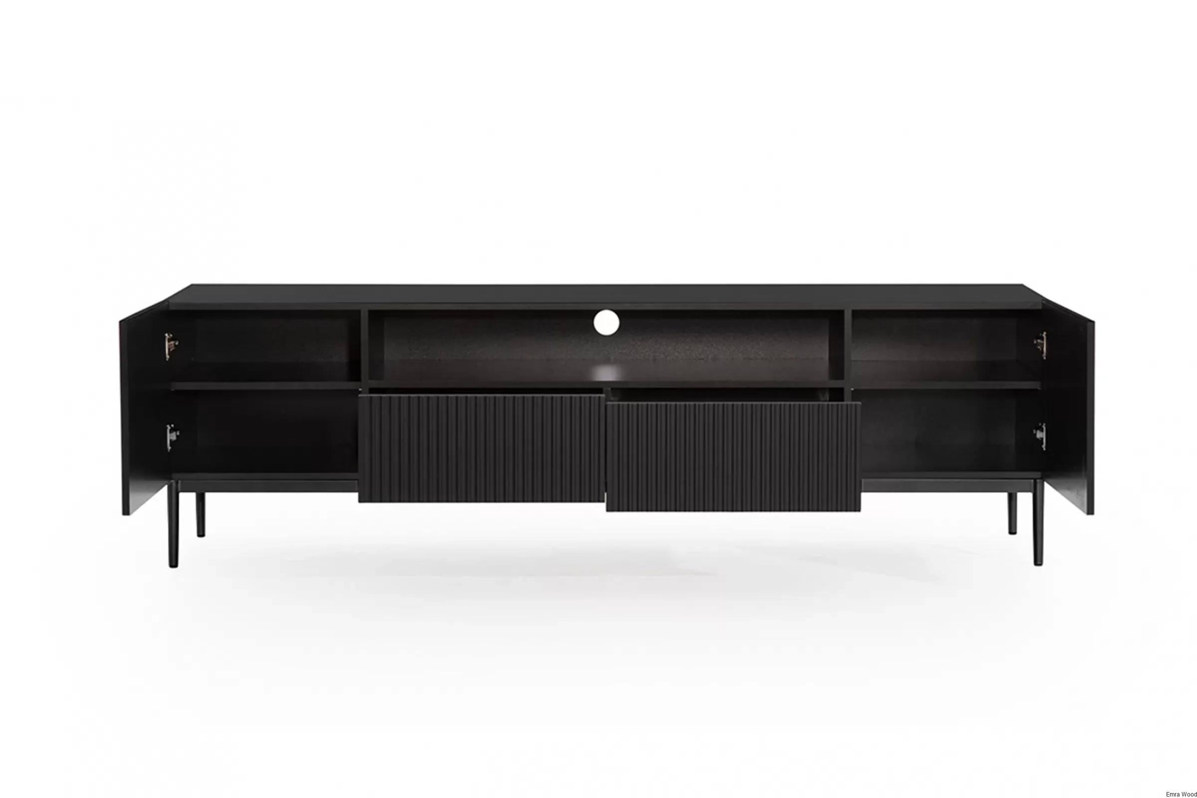 Wykonana z płyty laminowanej i MDF, szafka jest nie tylko estetyczna, ale także solidna i trwała. Jej metalowe nogi z podkładką gumową zapewniają stabilność, a system cichego domyku drzwi i szuflad gwarantuje komfort użytkowania. Szafka wyposażona jest w dwie szuflady, dwie półki i jedną wnękę, które pomieszczą wszystkie Twoje urządzenia multimedialne.