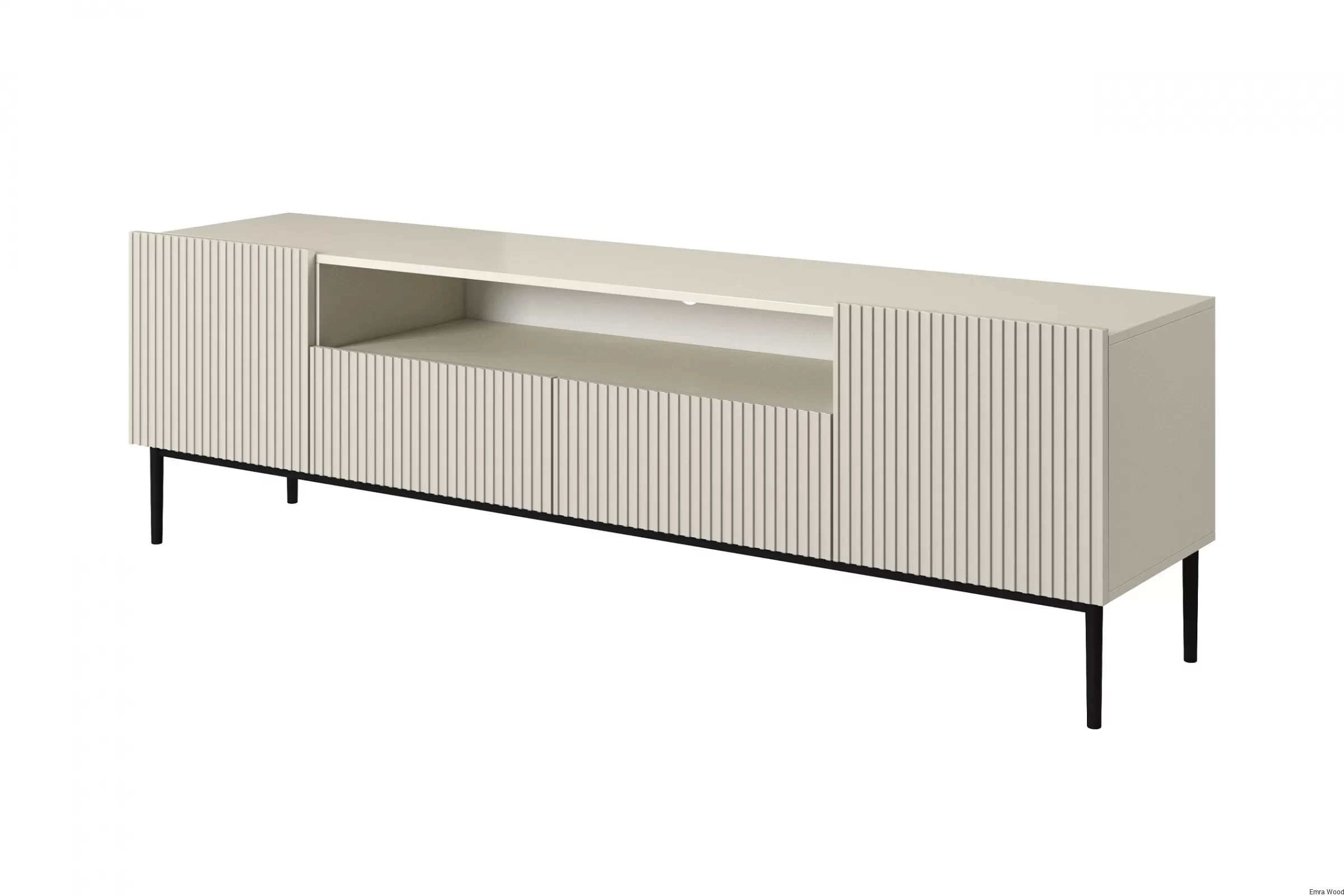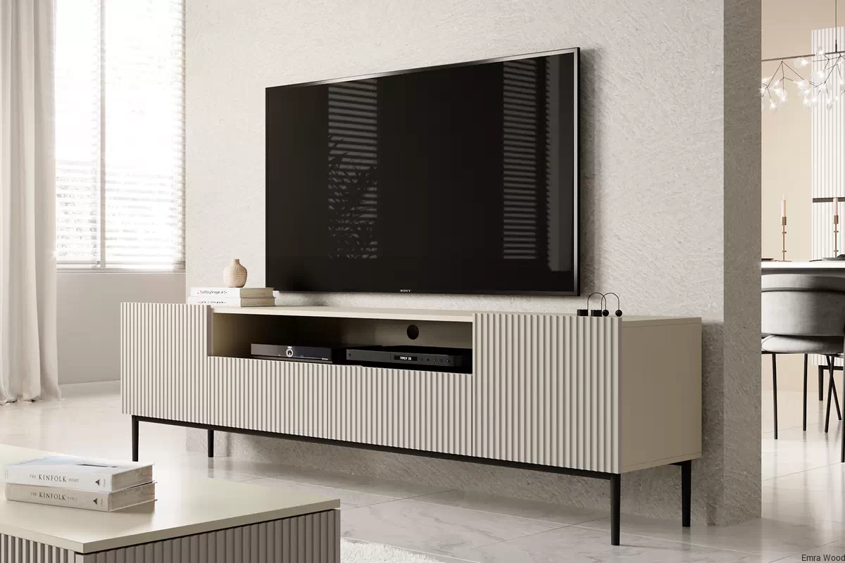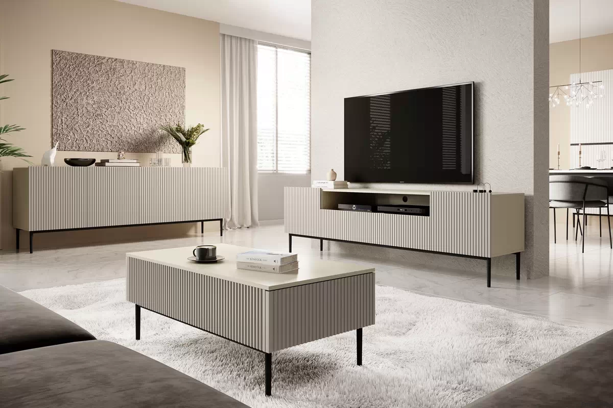 Neutralna kolorystyka w odcieniu kaszmiru optycznie powiększy przestrzeń, nadając jej lekkości i świeżości. Ryflowane fronty dodają meblom trójwymiarowej głębi i tekstury, tworząc ciekawy wizualny efekt, który przyciąga uwagę. Czarna metalowa podstawa kontrastuje z konstrukcją i zapewnia stabilne podparcie.