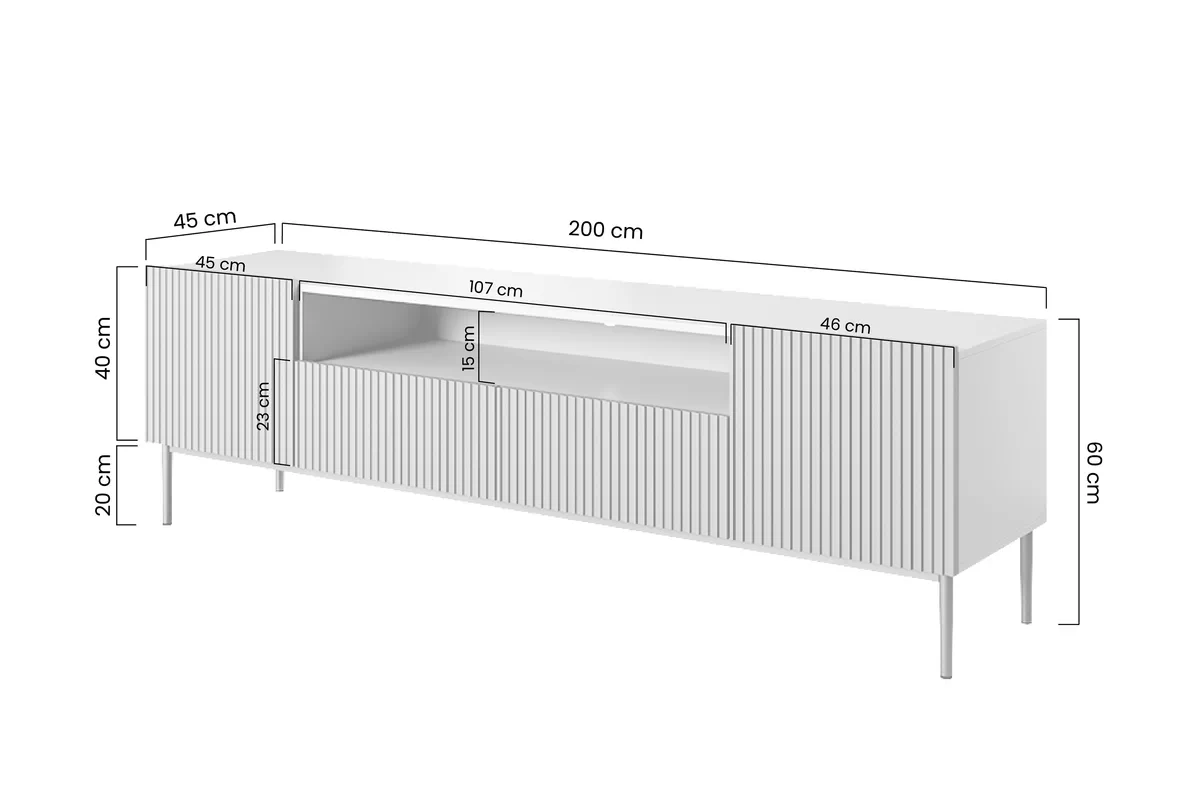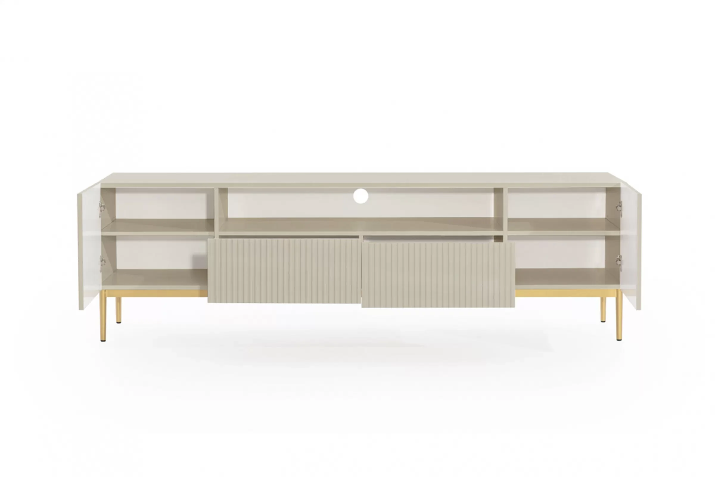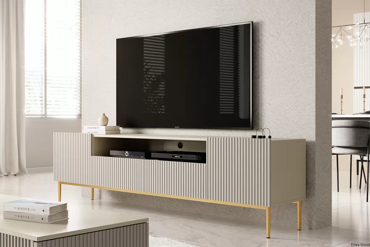 Czy szukasz mebla, który połączy w sobie wyrafinowany design, funkcjonalność i wytrzymałość? Szafka RTV Nicole z wnęką i metalowymi nogami 200 cm - kaszmir / złote nóżki to wszystko, czego potrzebujesz.
