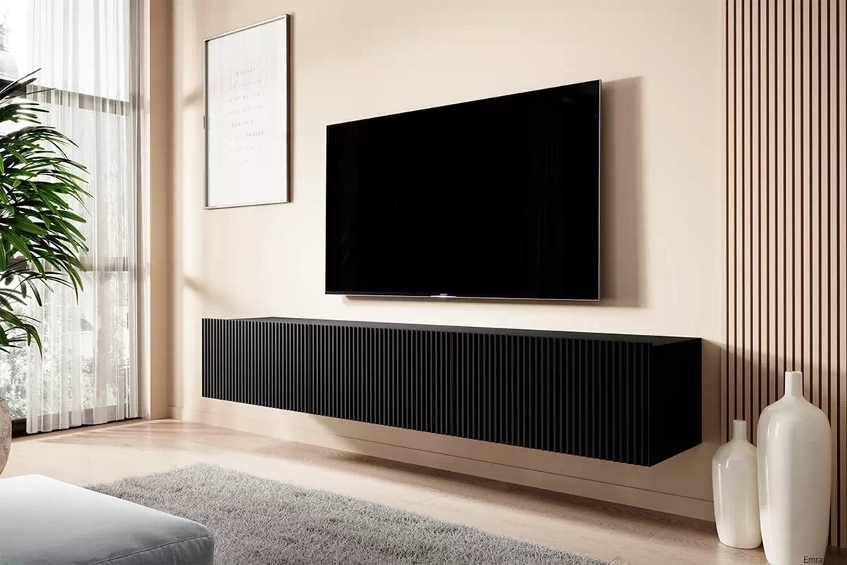 Czy kiedykolwiek marzyłeś o stylowym, funkcjonalnym i wyjątkowym miejscu do przechowywania sprzętu RTV? Wisząca szafka RTV Nicole z szufladą 200 cm - czarny / czarny mat to idealne rozwiązanie dla Ciebie.