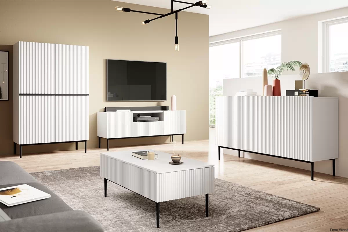 Wyobraź sobie elegancką szafkę o białym, matowym wykończeniu, które dodaje jej wyrafinowanego, nowoczesnego wyglądu. A teraz zobacz, jak czarne, metalowe nóżki dodają jej charakteru i kontrastu. To prawdziwe dzieło sztuki, które przyciąga wzrok i dodaje Twojemu salonowi wyjątkowego stylu.