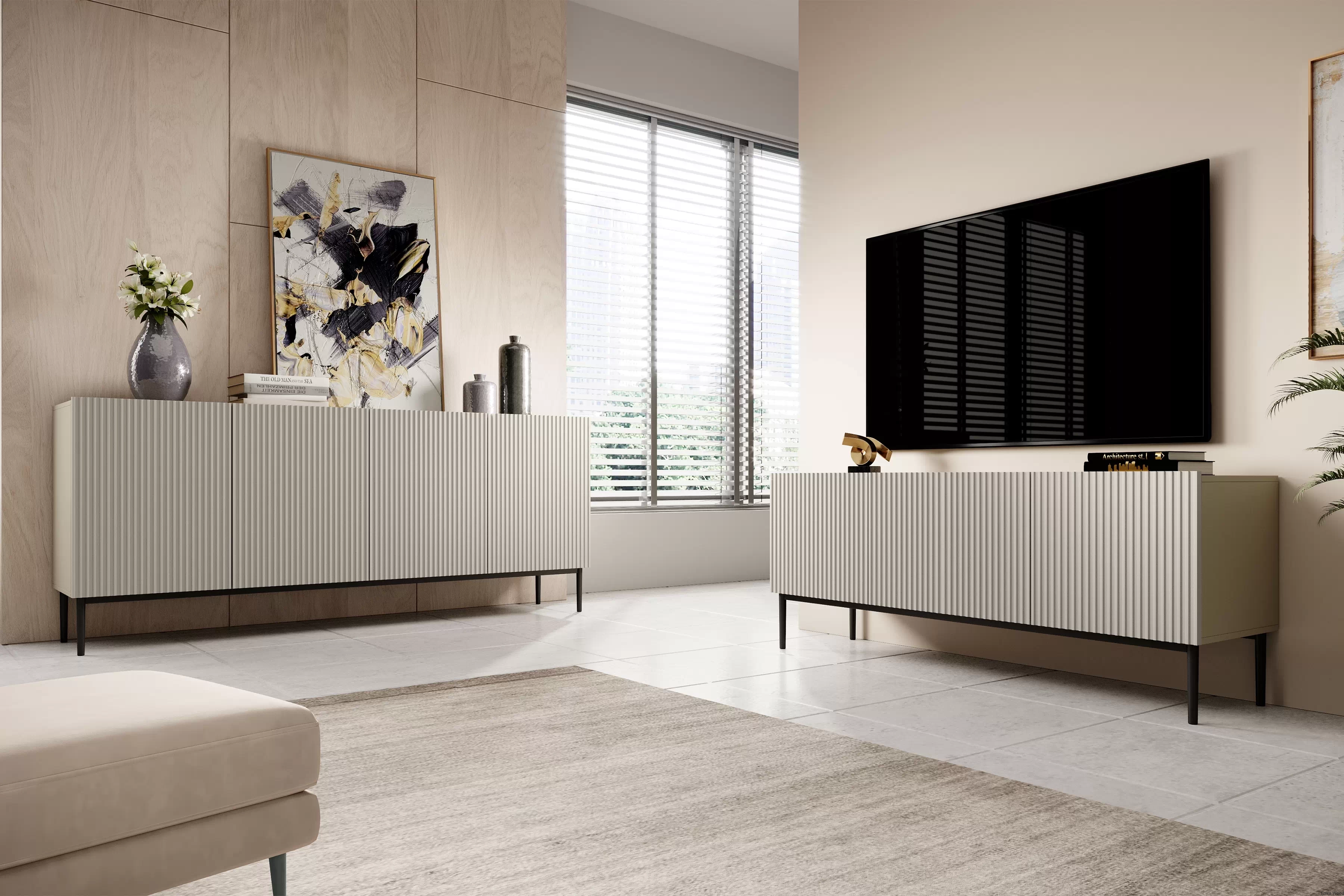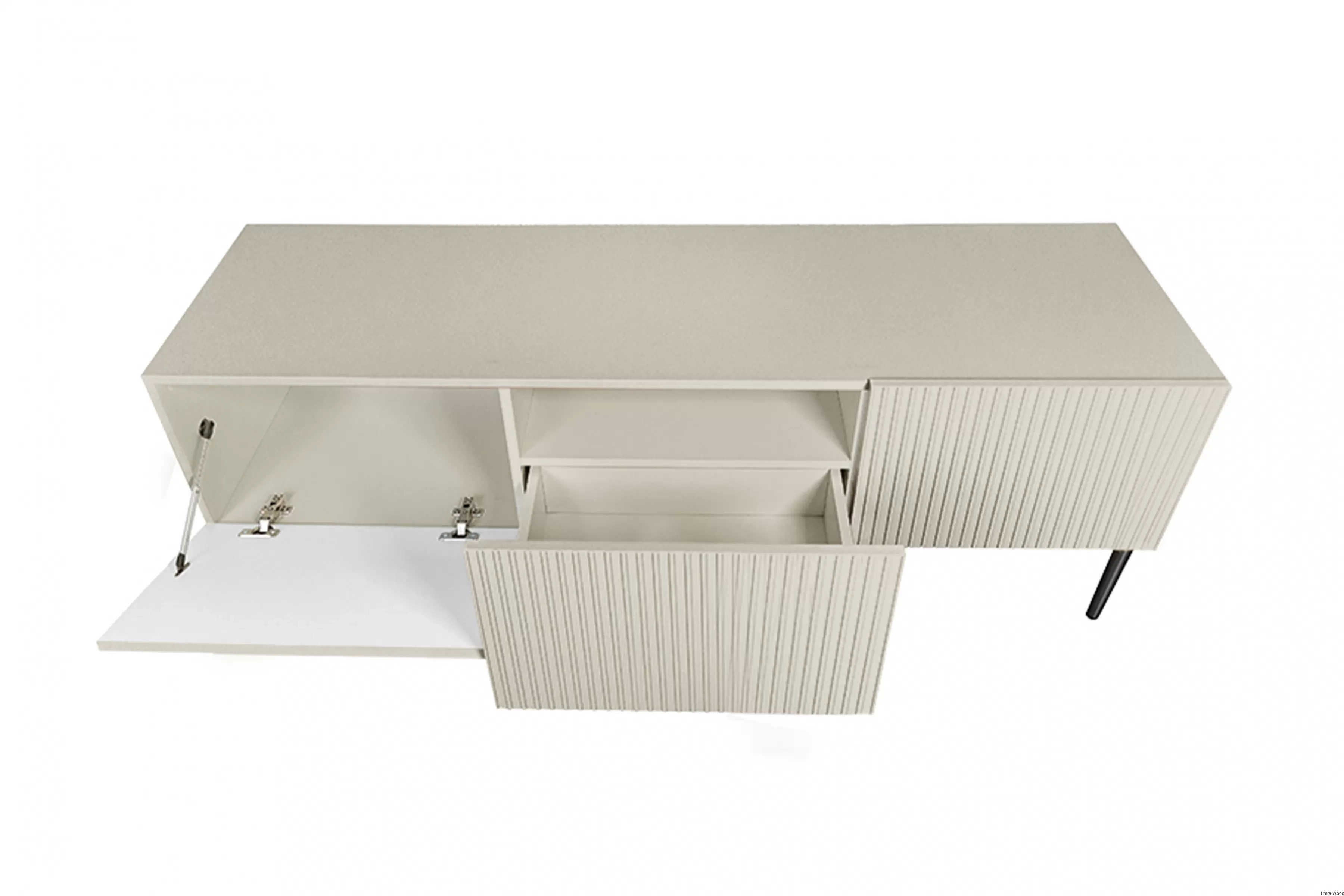 Poszukujesz unikalnego mebla, który doda twojemu salonowi wyjątkowego charakteru? Oto Szafka RTV Nicole 150 cm na metalowych nogach z szufladą - kaszmir / czarne nóżki.