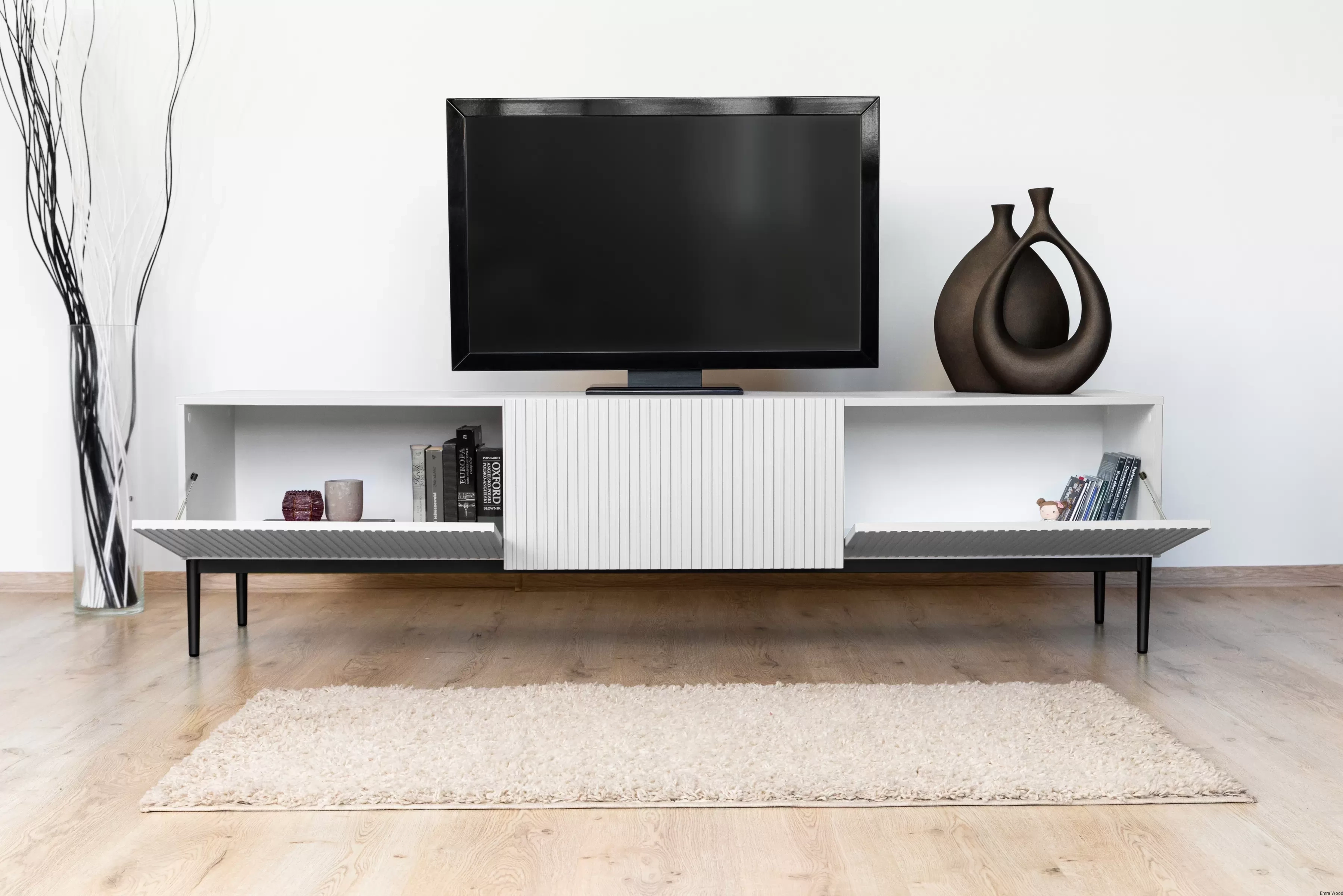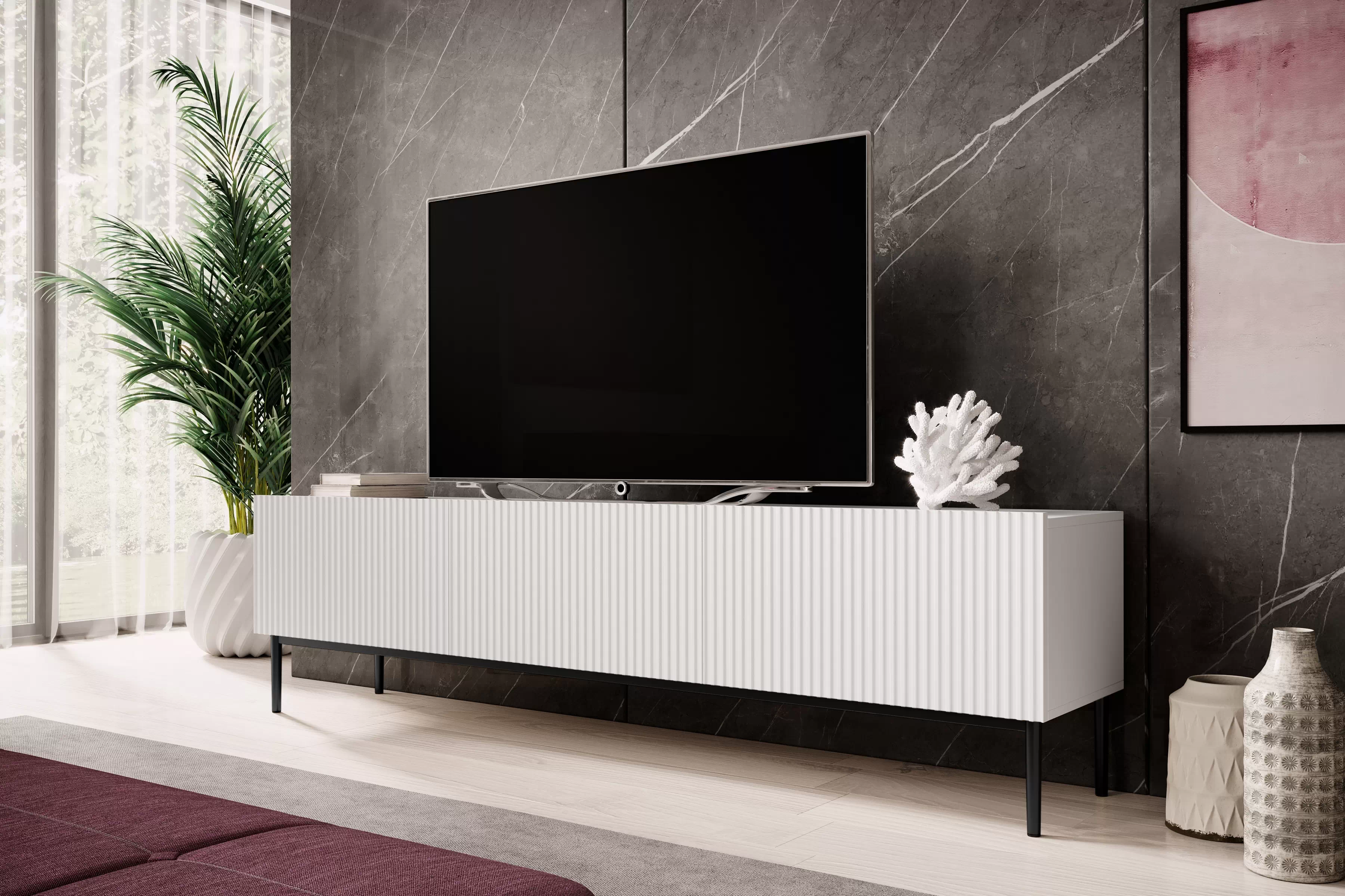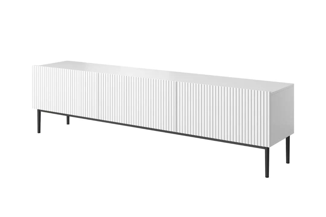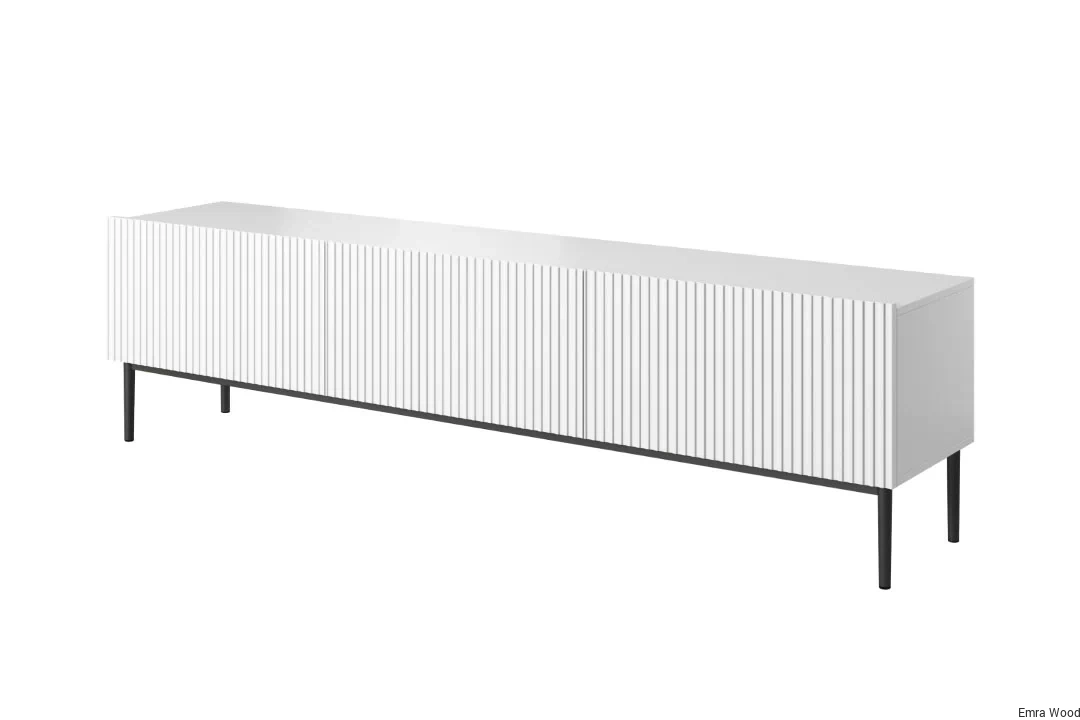 Zastanawiałeś się kiedyś, jak wyglądałaby Twoja przestrzeń dzienna z nowoczesnym, funkcjonalnym i stylowym meblem RTV? Szafka RTV Nicole z szufladą i metalowymi nogami 200 cm, w kolorze białym mat z czarnymi nóżkami, to idealne rozwiązanie dla Ciebie.