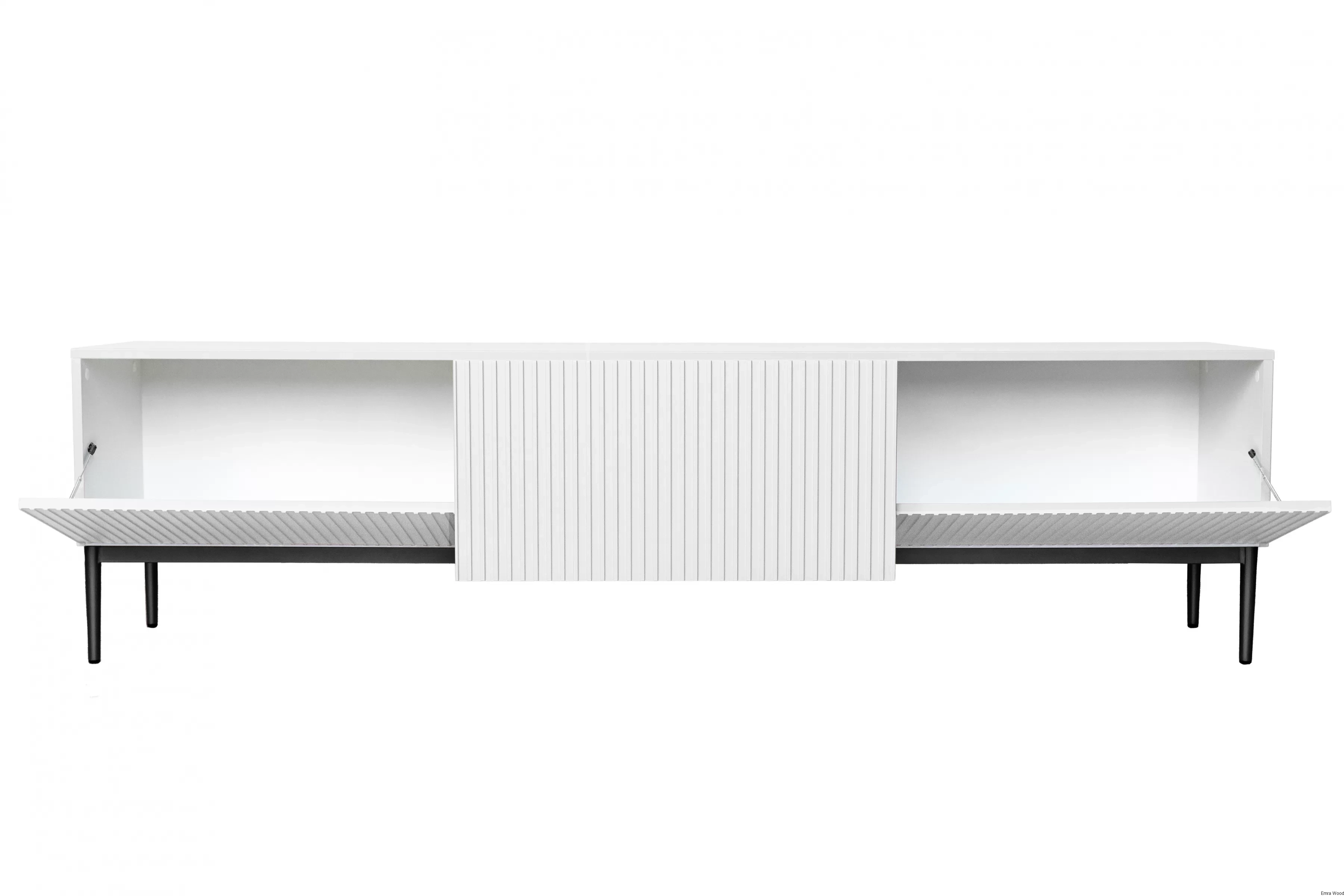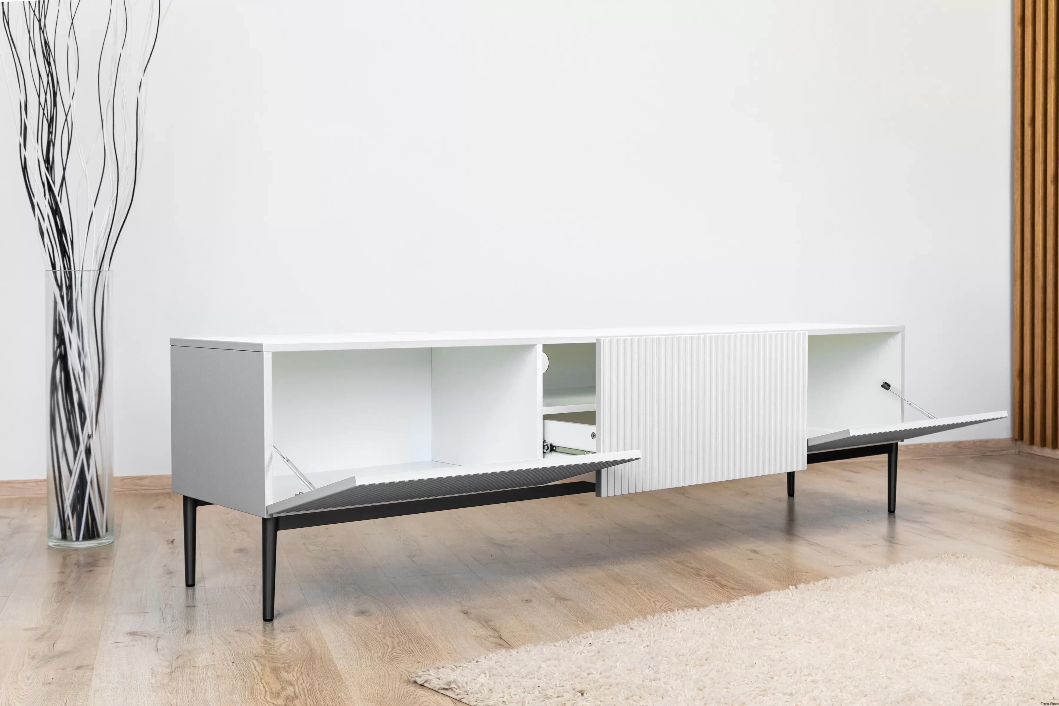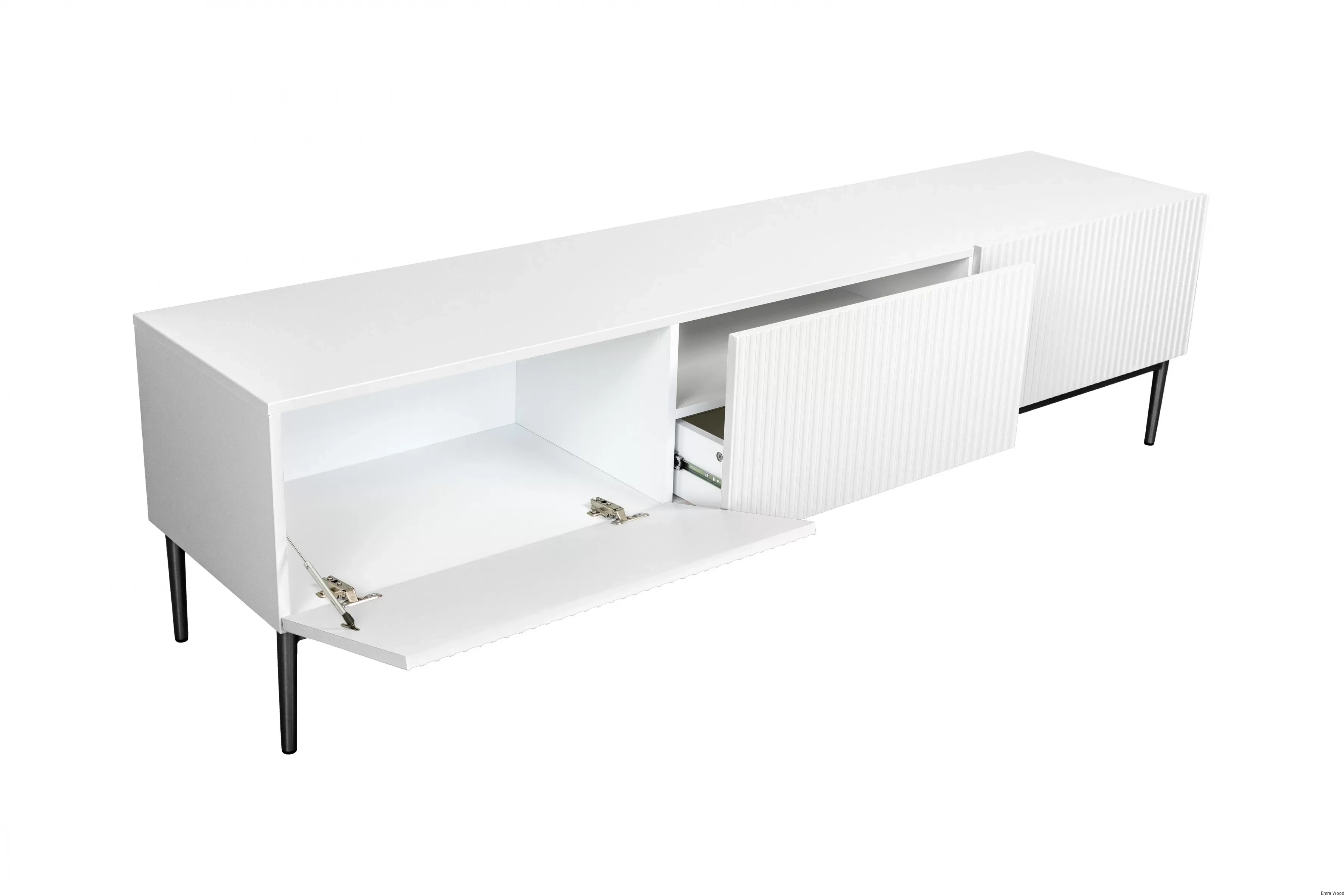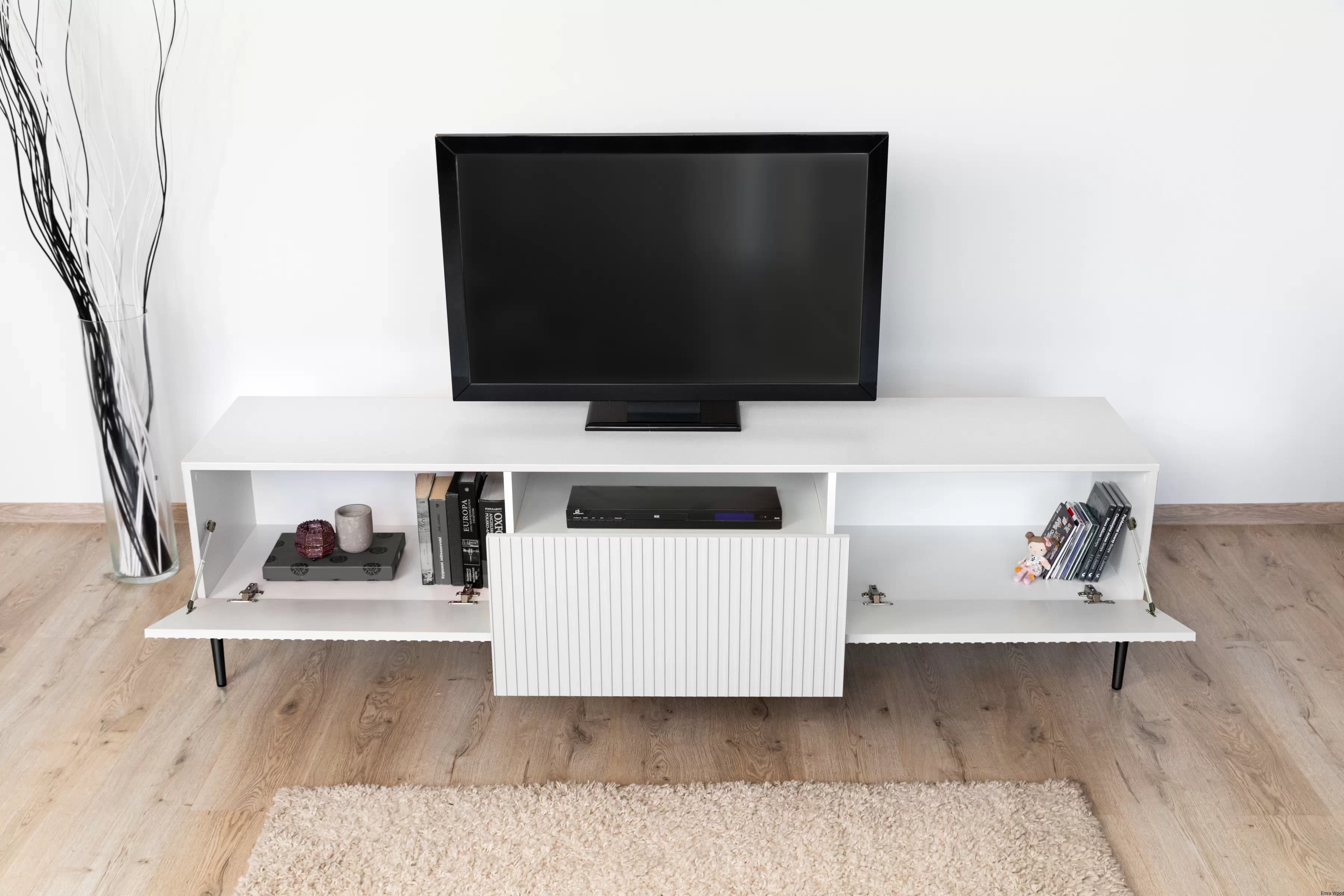 Wykonana z 18 mm płyty MDF, szafka RTV Nicole, jest nie tylko estetyczna, ale także wyjątkowo solidna. Metalowe nogi z podkładką gumową zapewniają stabilność, a system cichego domyku sprawia, że korzystanie z niej to czysta przyjemność. Dodatkowo, ryflowane fronty oraz front wysunięty do góry, to szczegóły, które dodają meblowi unikalności. Szuflada i dwie klapy to praktyczne rozwiązanie, które pozwoli Ci uporządkować przestrzeń.