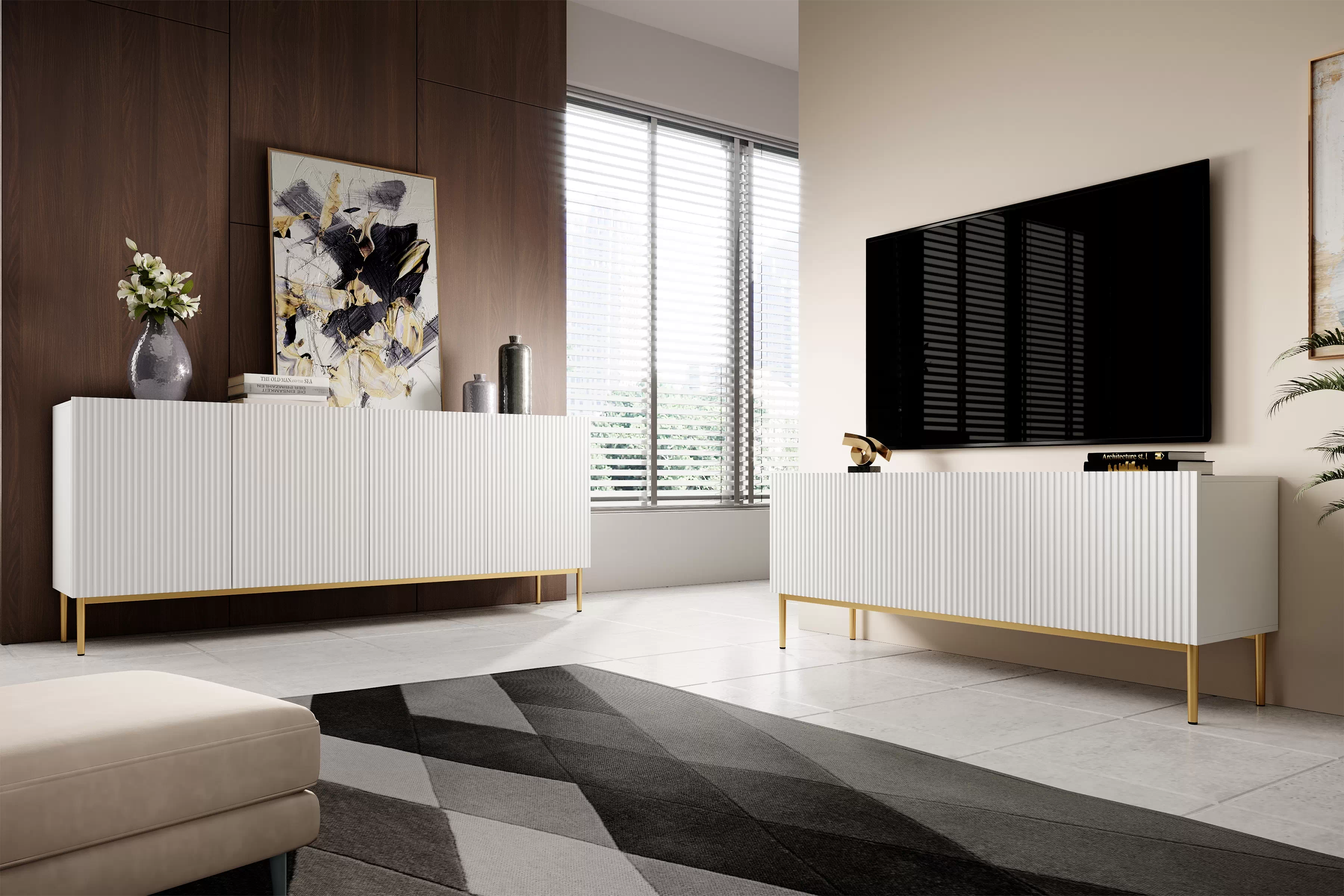 Szafka RTV Nicole nie tylko wygląda świetnie, ale jest również niezwykle funkcjonalna. Wykonana z płyty MDF o grubości 18 mm, z metalowymi nogami wyposażonymi w gumowe podkładki, gwarantuje stabilność i trwałość na wiele lat. System cichego domyku, ryflowane fronty i brak uchwytów to detale, które sprawiają, że mebel ten jest nie tylko praktyczny, ale i stylowy.