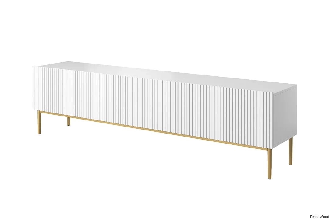 Szafka RTV Nicole nie tylko wygląda świetnie, ale jest również niezwykle funkcjonalna. Wykonana z płyty MDF o grubości 18 mm, z metalowymi nogami wyposażonymi w gumowe podkładki, gwarantuje stabilność i trwałość na wiele lat. System cichego domyku, ryflowane fronty i brak uchwytów to detale, które sprawiają, że mebel ten jest nie tylko praktyczny, ale i stylowy.