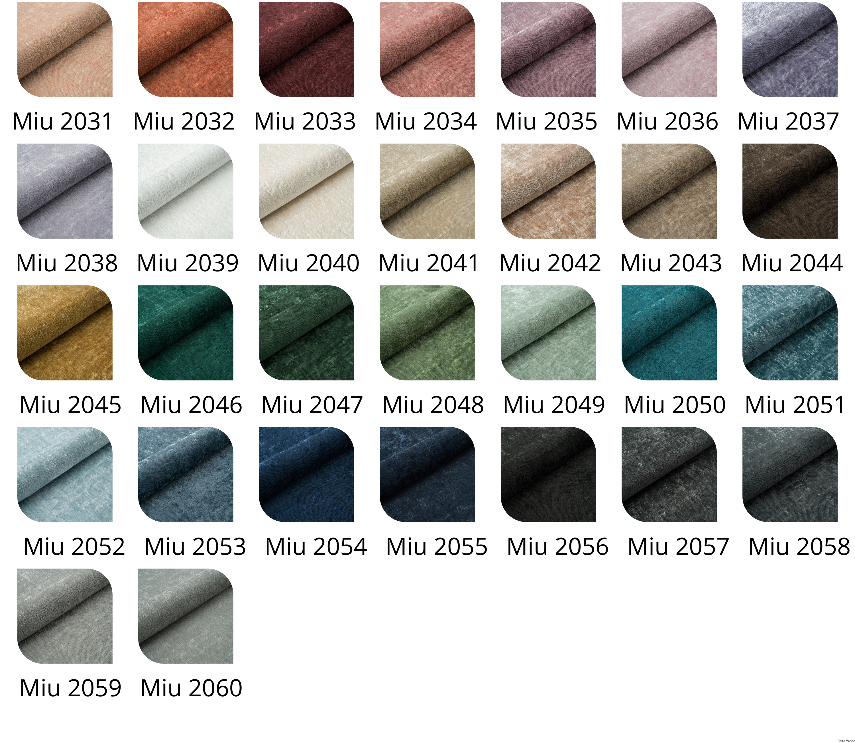 MIU – miękka tkanina szenilowa, odporna na zwierzęta i trudnopalna. Idealna na sofy, fotele, łóżka, zasłony i poduszki. Dostępna w 30 kolorach.