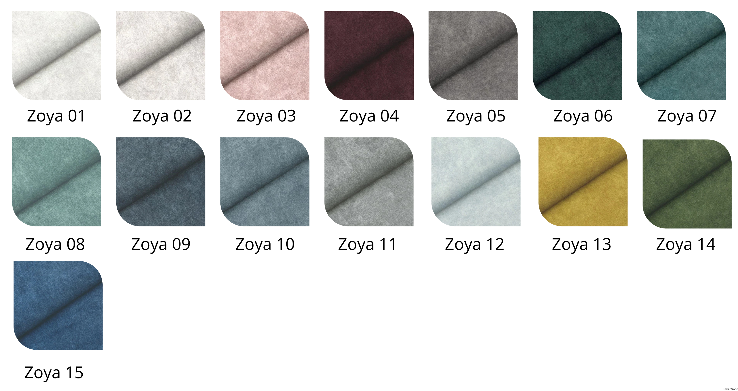 Prezentowana tkanina obiciowa ZOYA cechuje się gramaturą 390 g/m² ± 5%, a jej szerokość to 140 ± 2 cm. Uwagę zwraca również wysoka odporność na ścieranie - wynosi ono ok. 50 000 cykli. Tkanina ZOYA jest dostępna w różnych wersjach kolorystycznych, ale wszystkie barwy mają lekko przygaszony, spokojny charakter, dzięki któremu łatwo jest dopasowywać do takiej tapicerki inne elementy związane z aranżacją wnętrza – np. dodatki czy akcesoria. Dodatkowo tkanina obiciowa Zoya posiada aktualny certyfikat Oeko-Tex Standard 100. Tapicerka ZOYA cechuje się trudnopalnością, co było testowane. Można też ją prać w 30 st. ℃, jest łatwa do wyczyszczenia oraz przyjazna dla zwierząt.