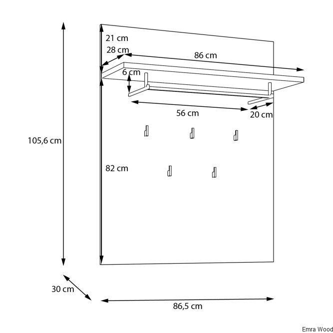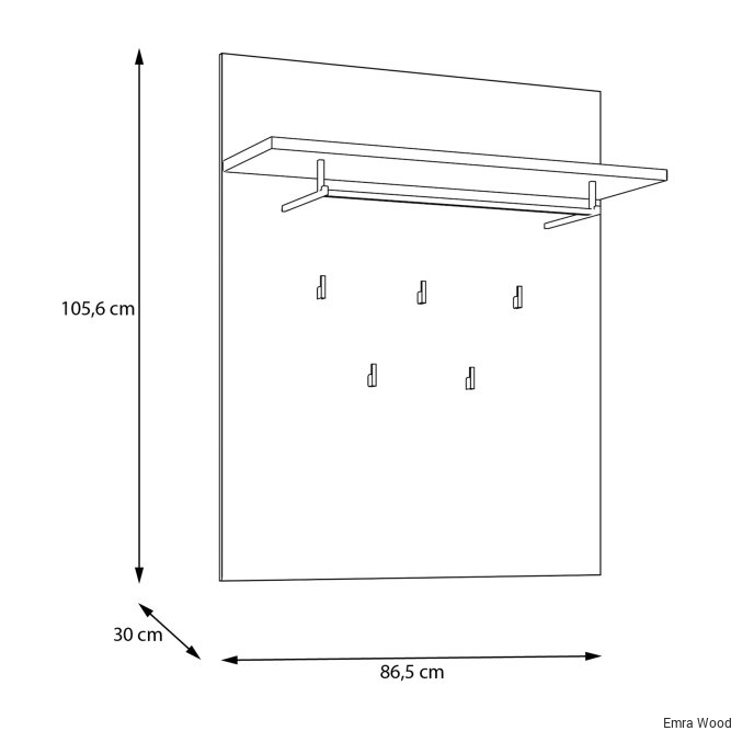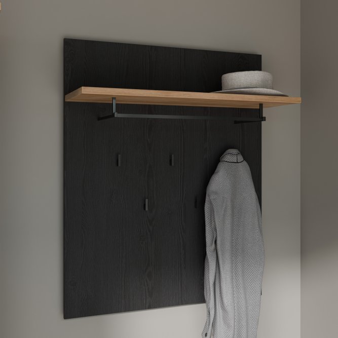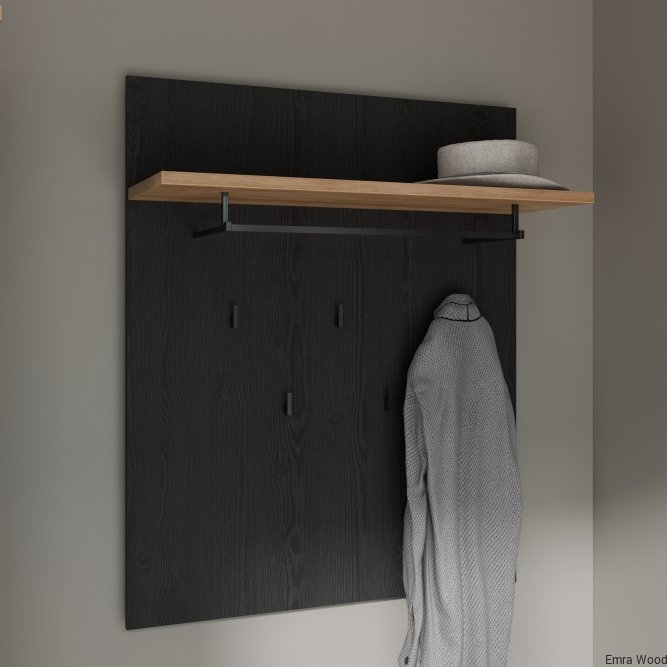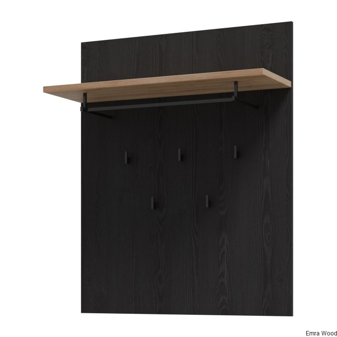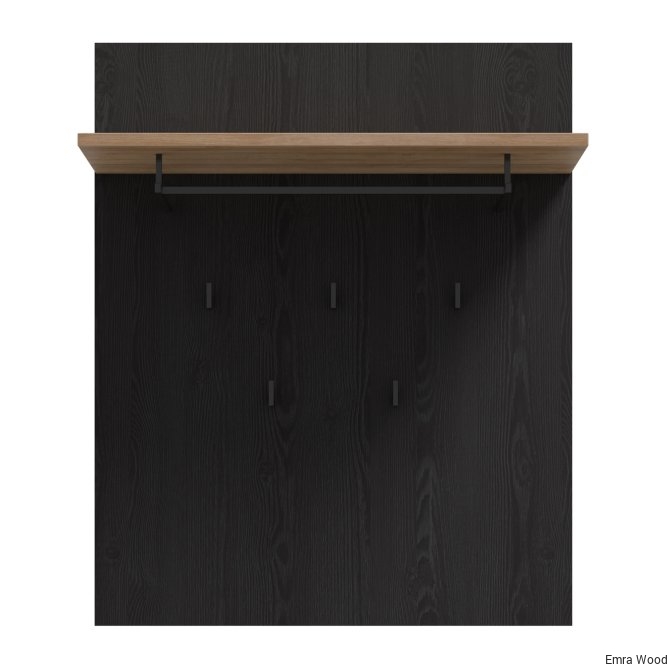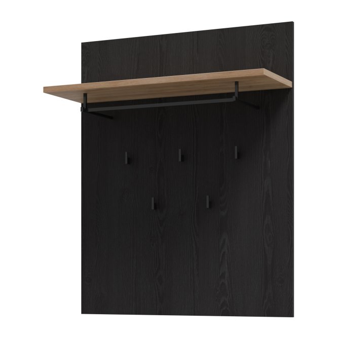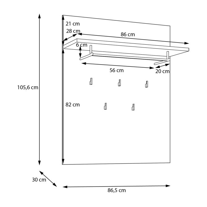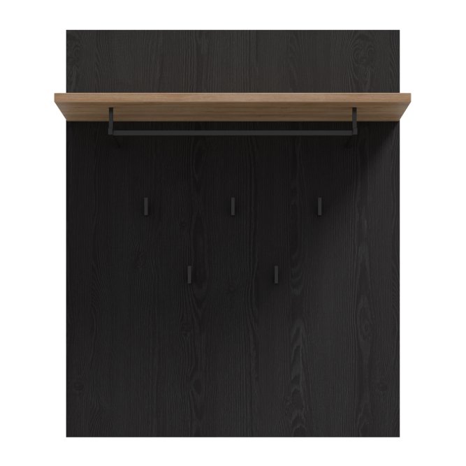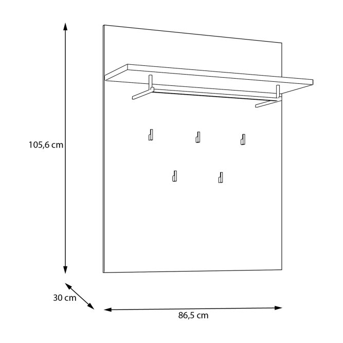 Panel wiszący dopełni klasyczną aranżację przedpokoju. Wyposażony w półkę, drążek na wieszak oraz 5 haczyków tworzy miejsce na odzież wierzchnią i dodatki. Możesz zawiesić panel w towarzystwie lustra, nad szafką na buty lub w pobliżu szafy i komody.