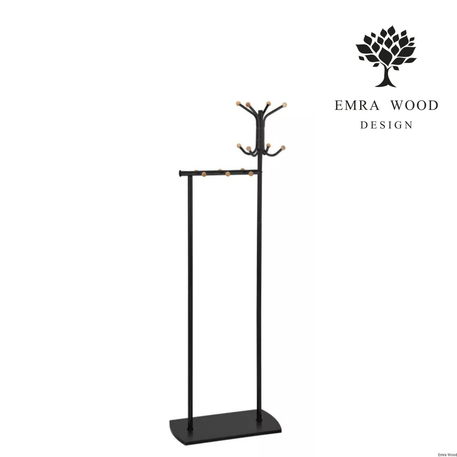 - Wieszak, materiał: metal + drewno , kolor: czarny + buk, średnica korony 28 cm, podstawa 30x60 cm. Wysokość 177 cm