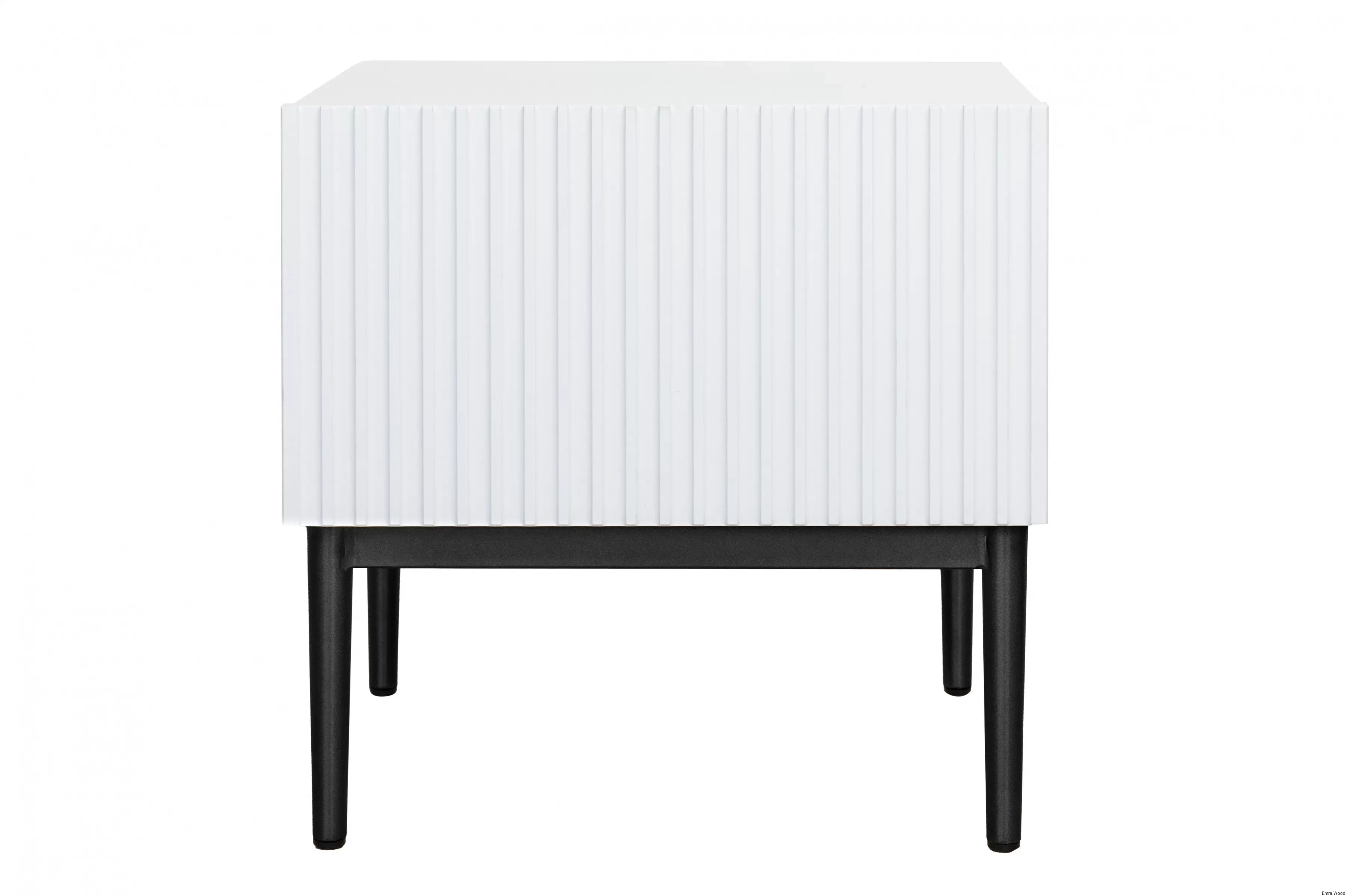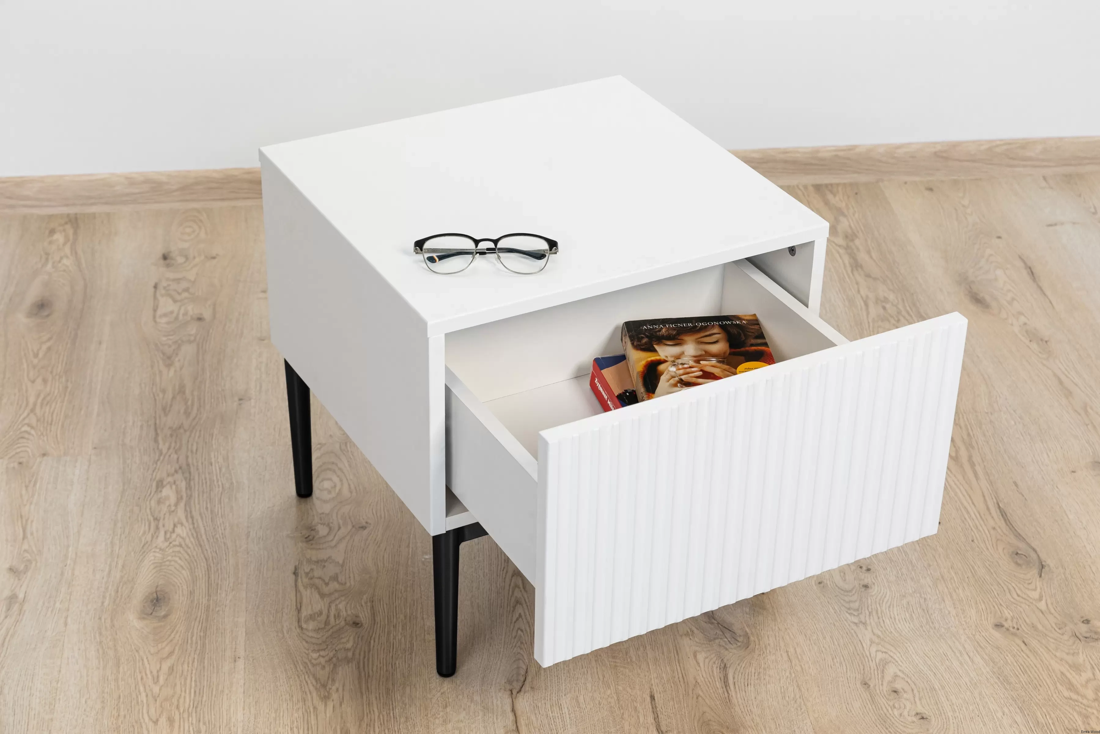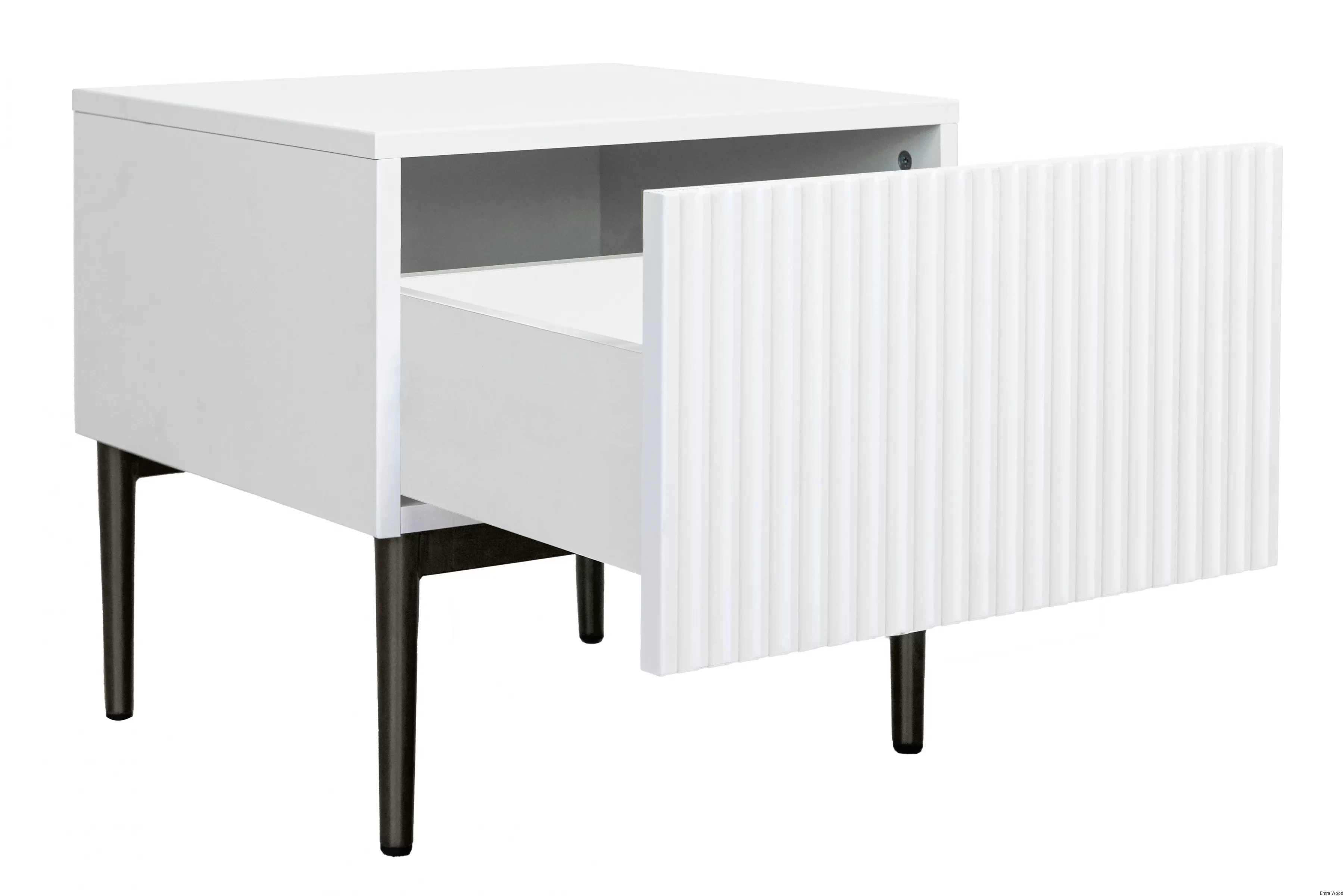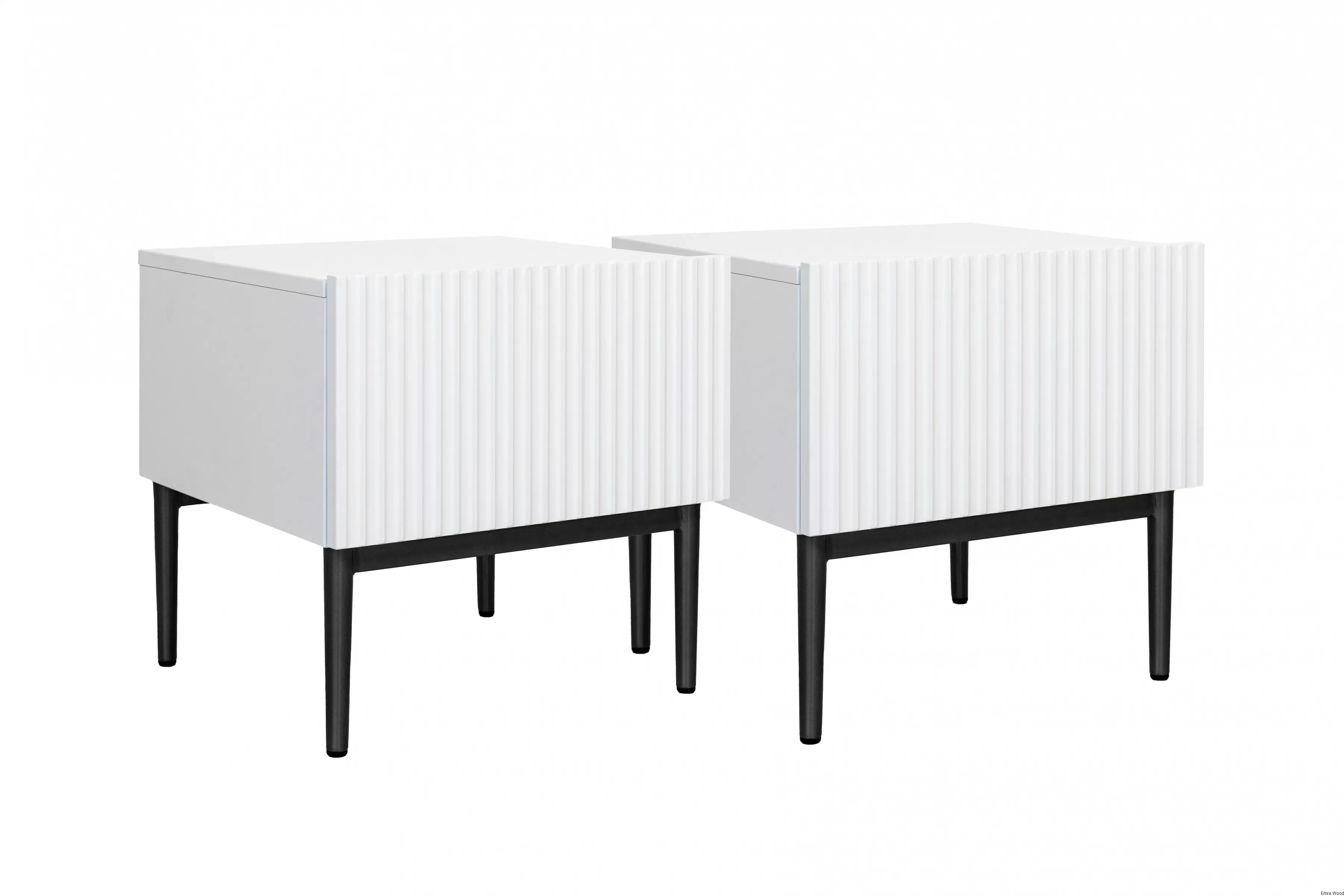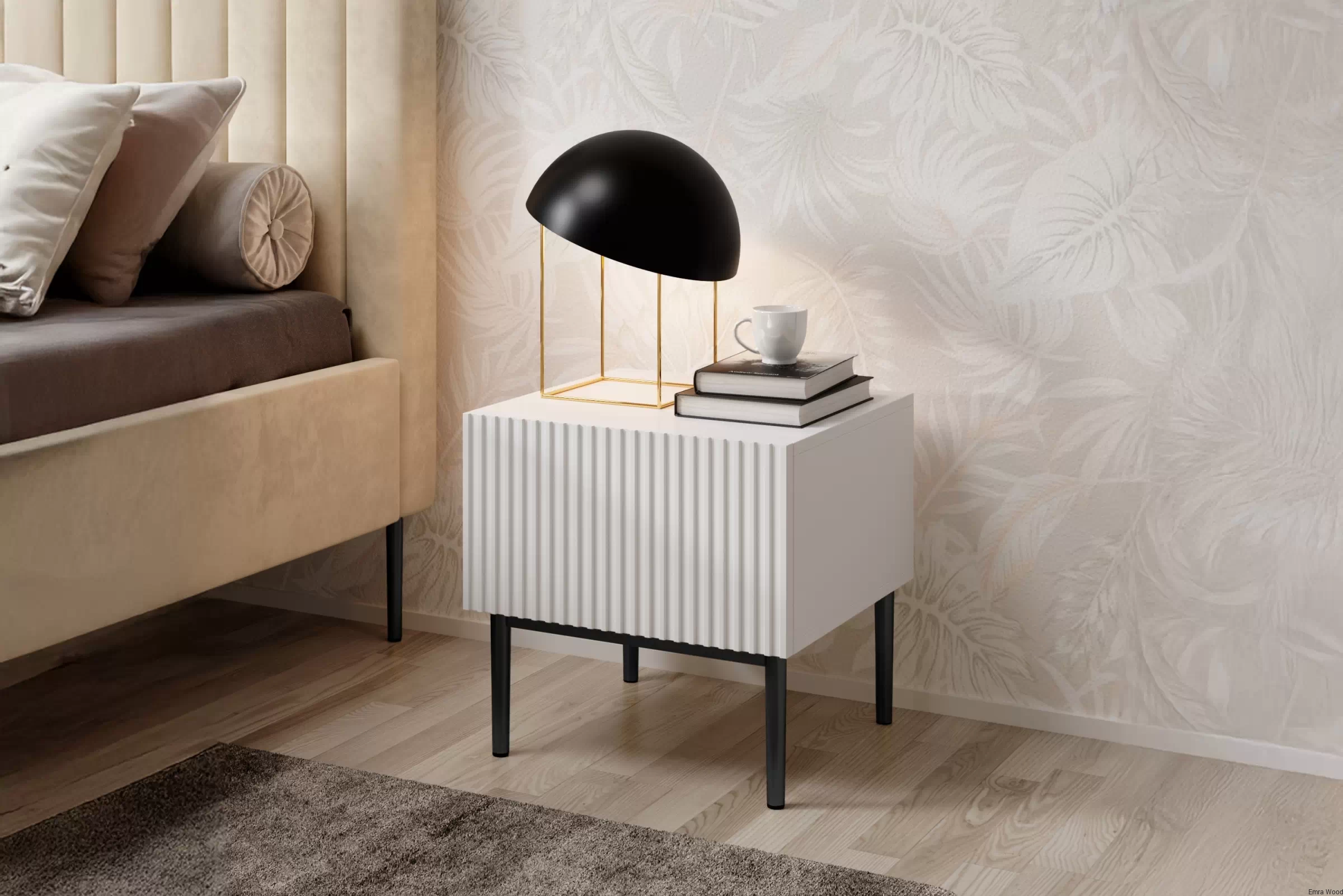 Ich biały kolor optycznie powiększa przestrzeń, co jest szczególnie korzystne w przypadku niewielkich sypialni. Ryflowane fronty dodają wnętrzu unikalnego, nowoczesnego wyglądu przełamując monotonie tradycyjnych frontów meblowych. Ponadto, czarne metalowe nóżki dodają szafkom elegancji z nutką luksusu.