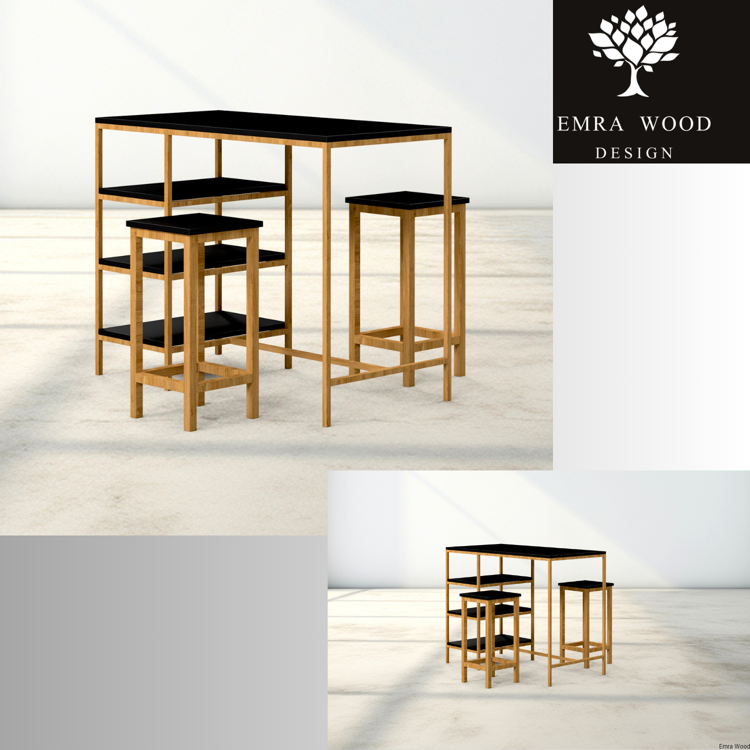 Zestaw Barowo Jadalniany Nogi z Drewna Litego Dębowego, Blat Czarny Płyta MDF Stół + 4 Taborety Model  ZETS-7