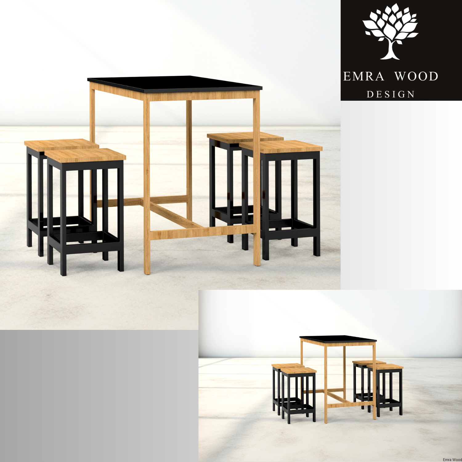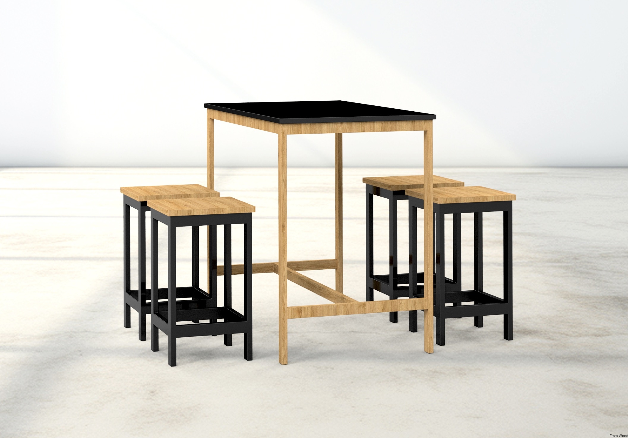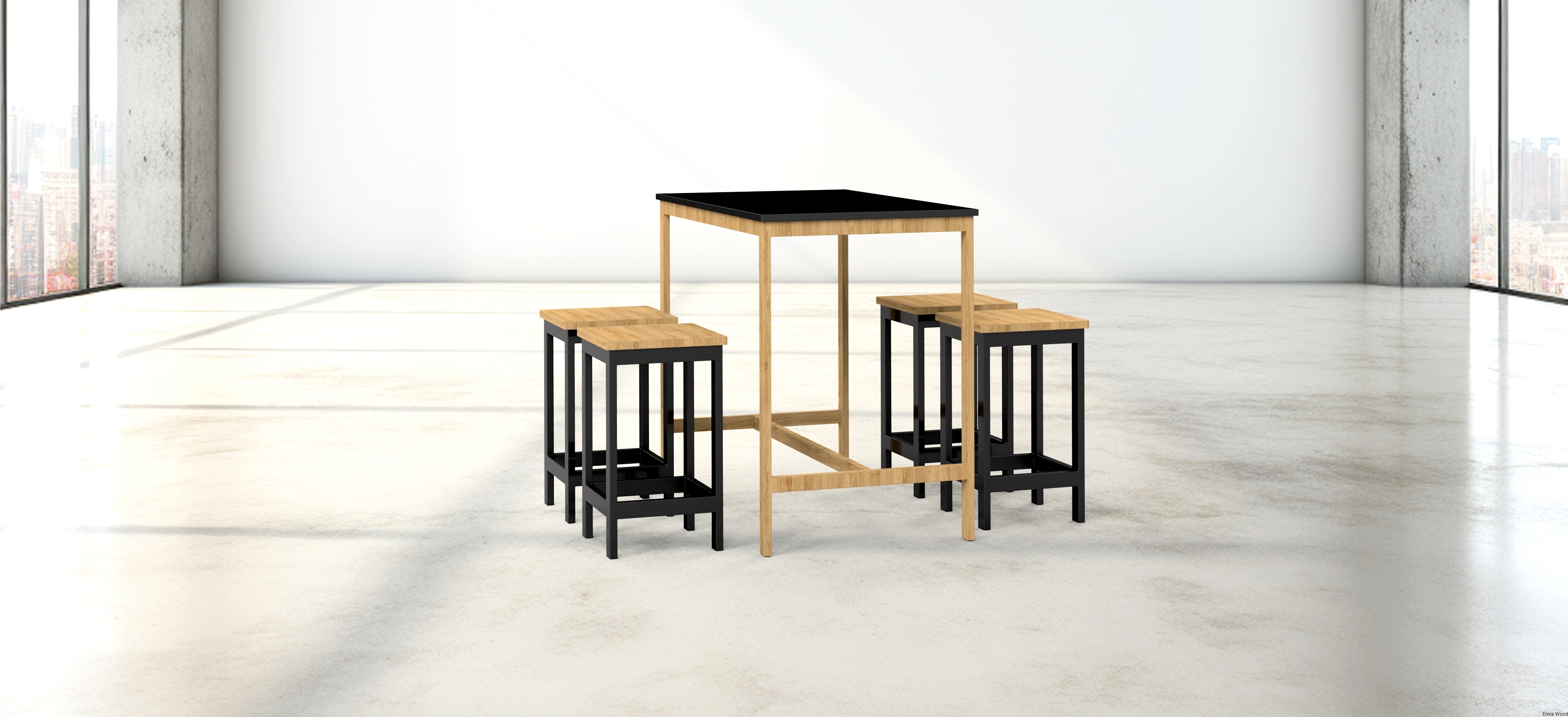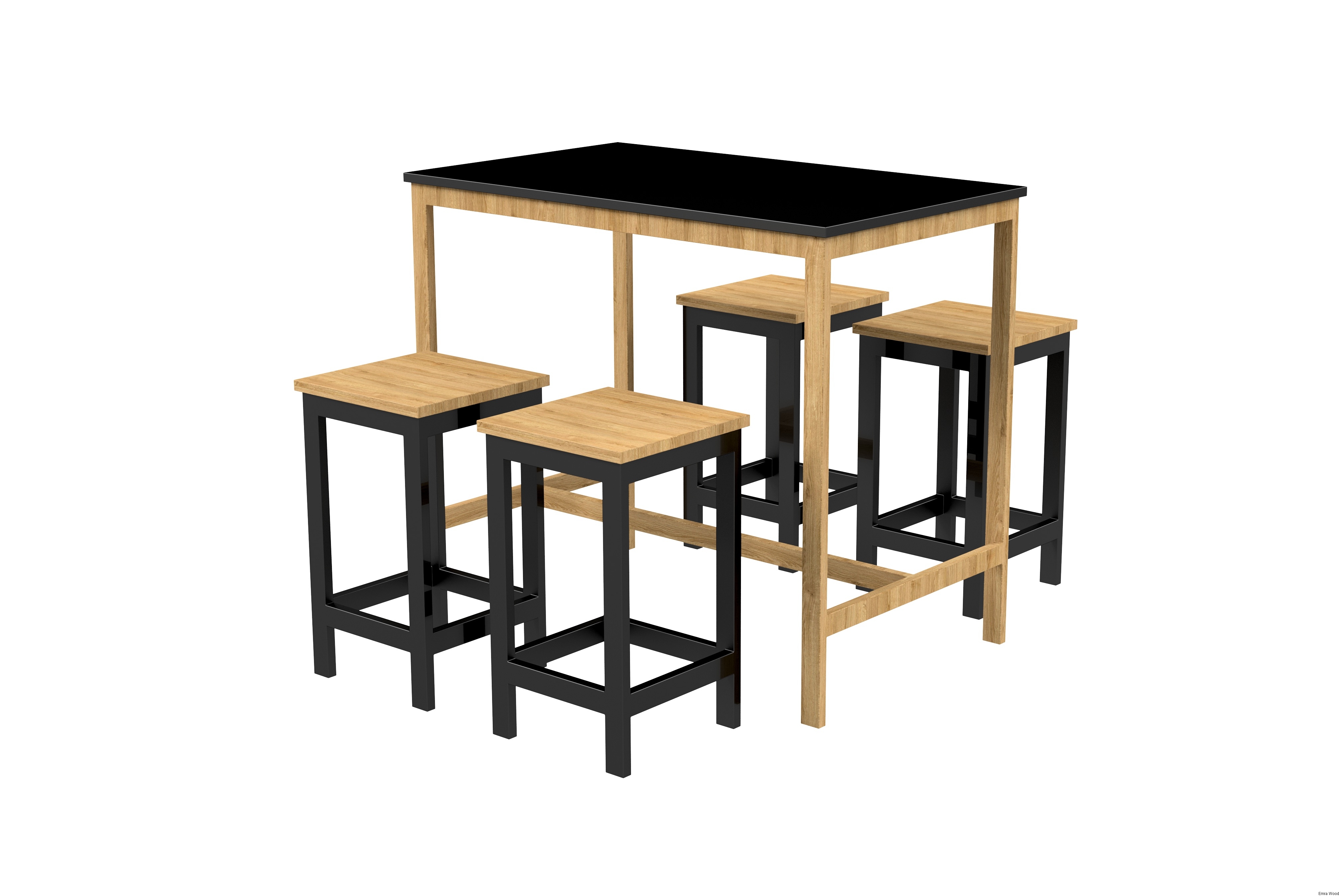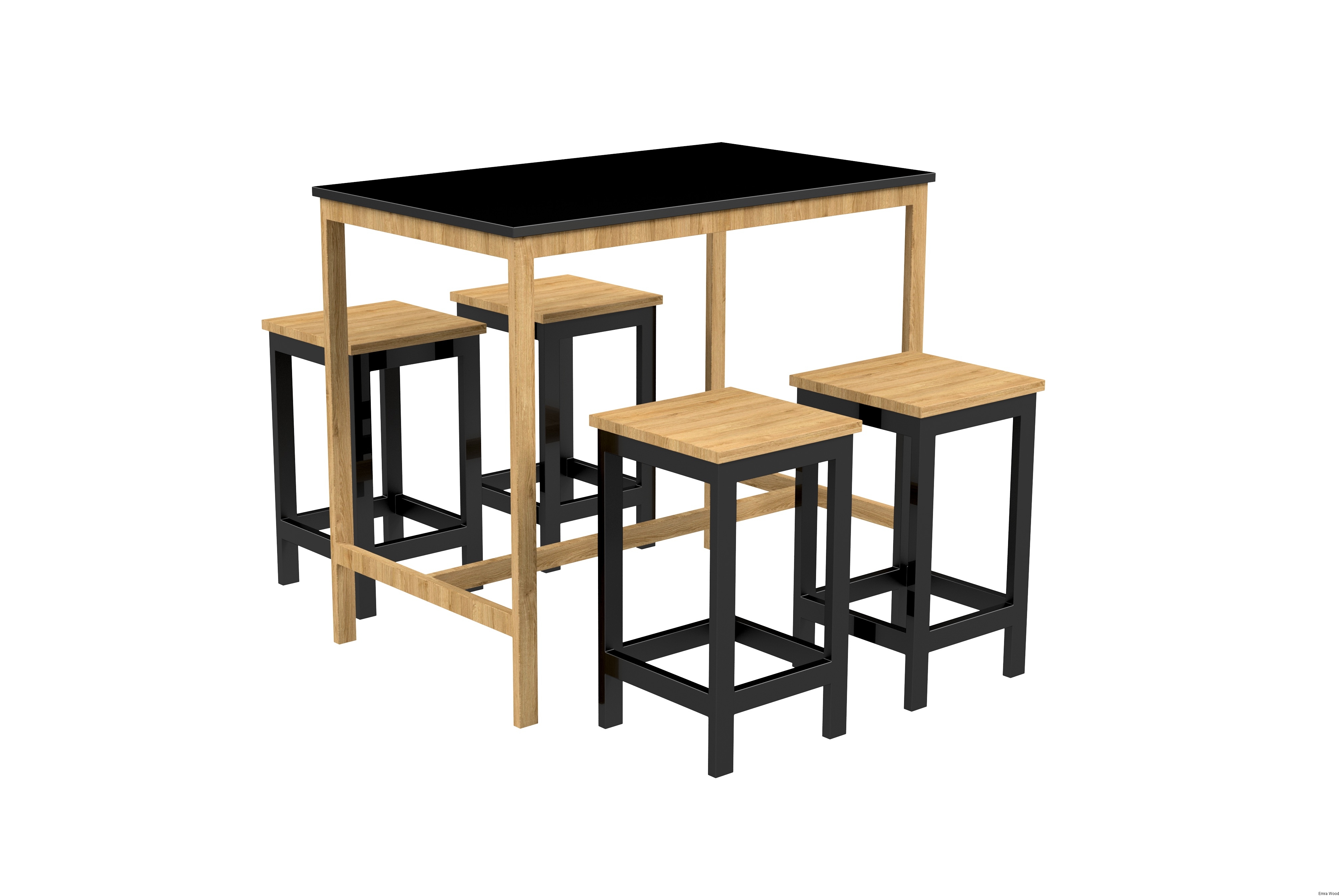 Zestaw Barowo Jadalniany Nogi z Drewna Litego Dębowego, Blat Czarny Płyta MDF Stół + 4 Taborety Model  ZETS-7