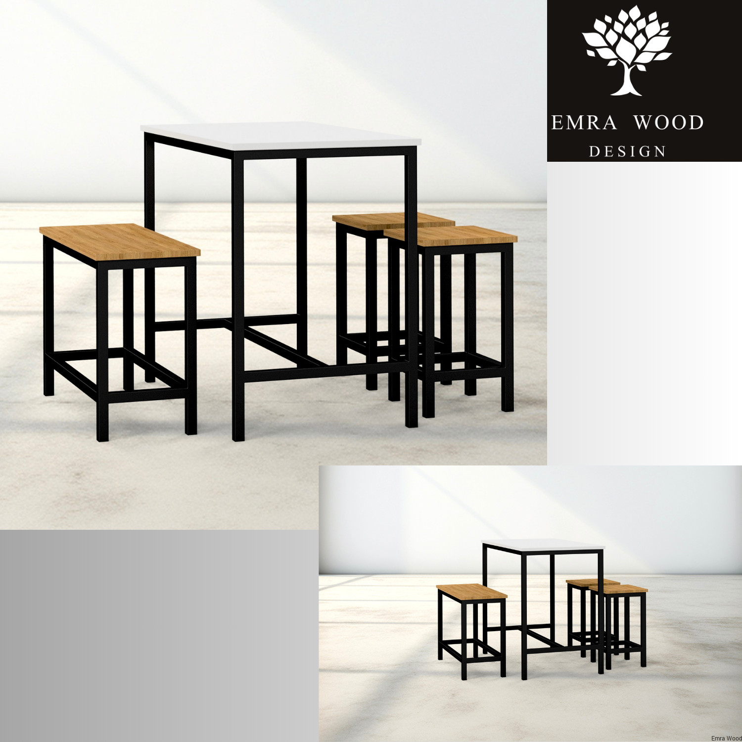 Blat stołu wykonany jest z płyty MDF pokrytej matowym lakierem.  Siedziska hokerów, ławek wykonane są z wysokiej jakości drewna dębowego .
