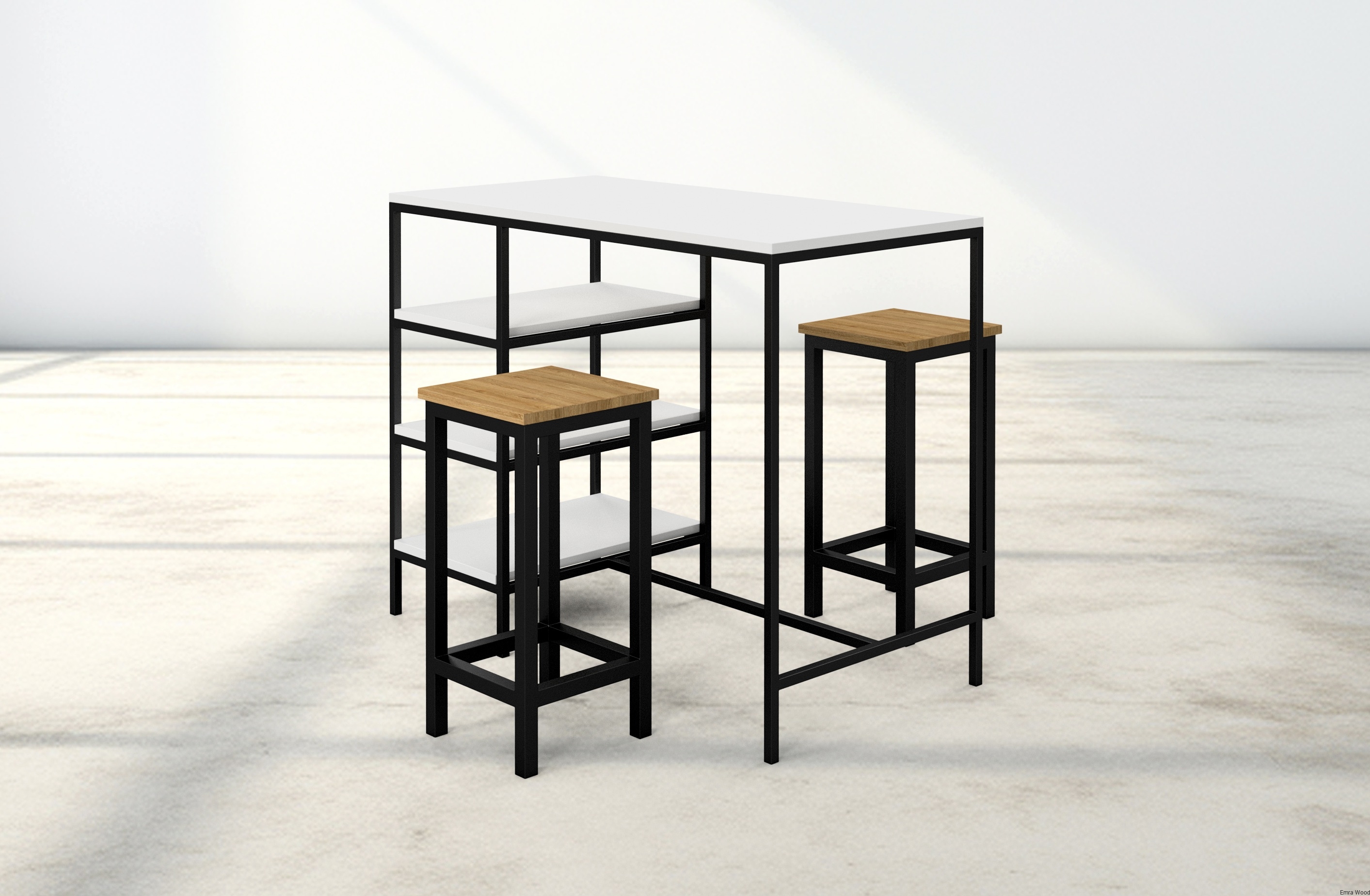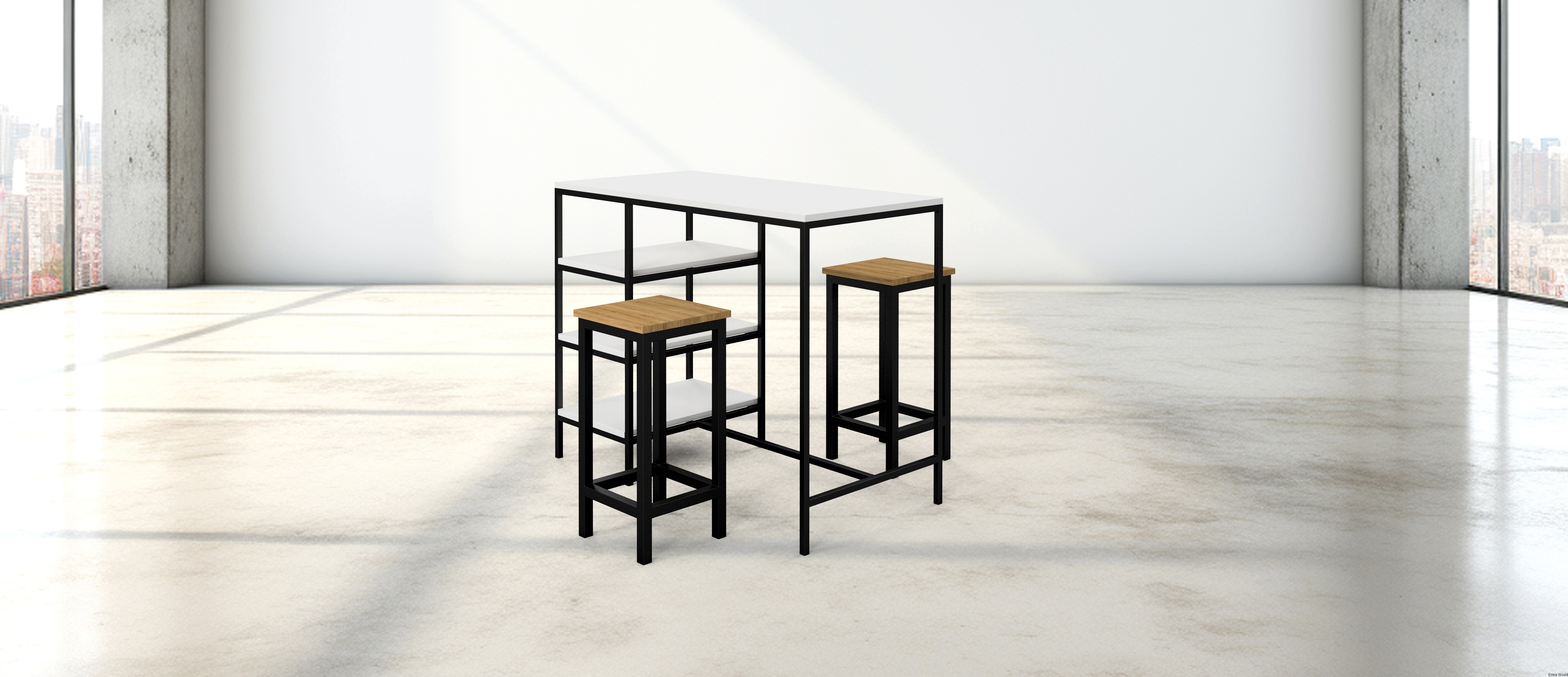 Zestaw Barowo -Jadalniany z Metalu i Drewna Litego Dębowego  Stół + 2 Taborety Model ZETS-20