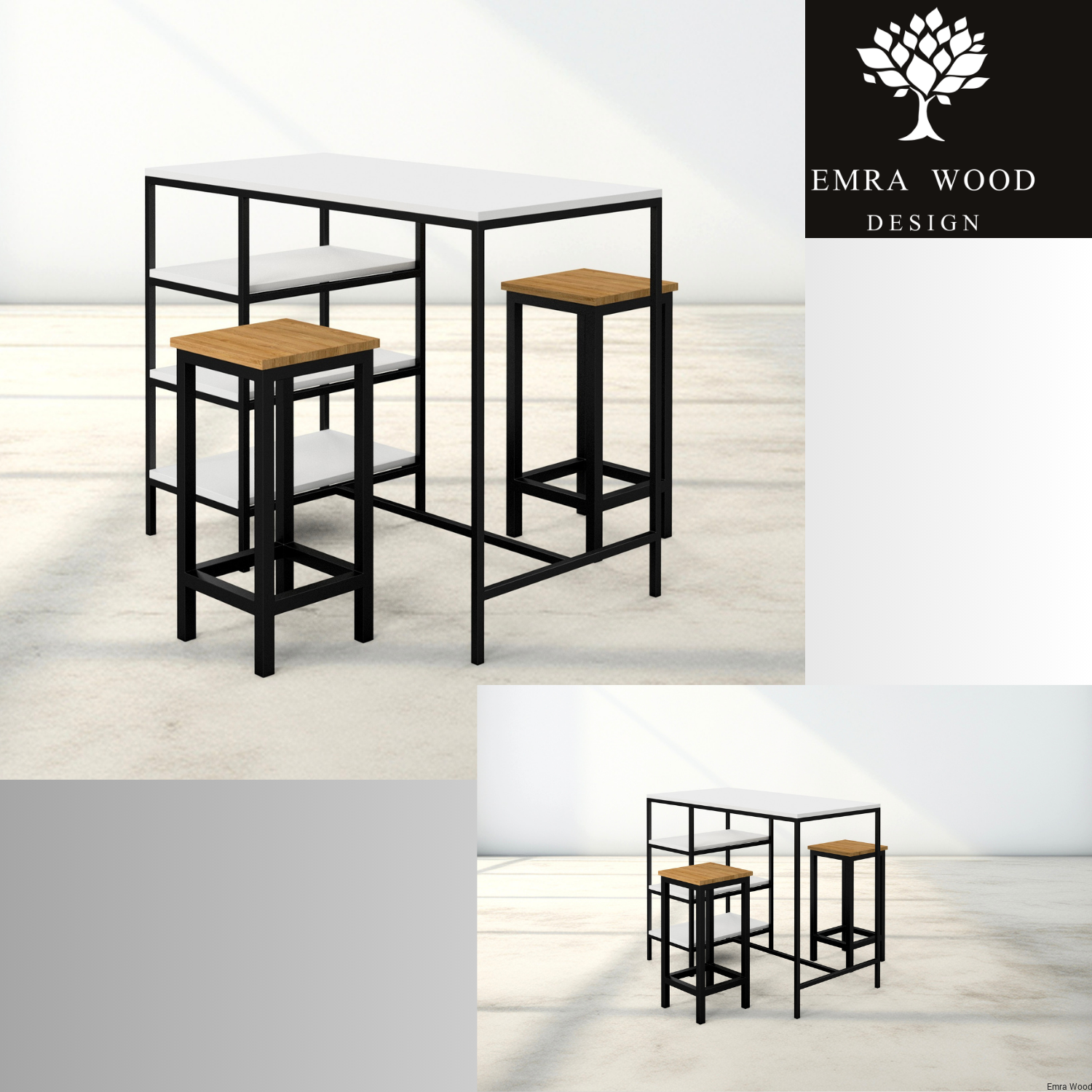Zestaw Barowo -Jadalniany z Metalu i Drewna Litego Dębowego  Stół + 2 Taborety Model ZETS-34