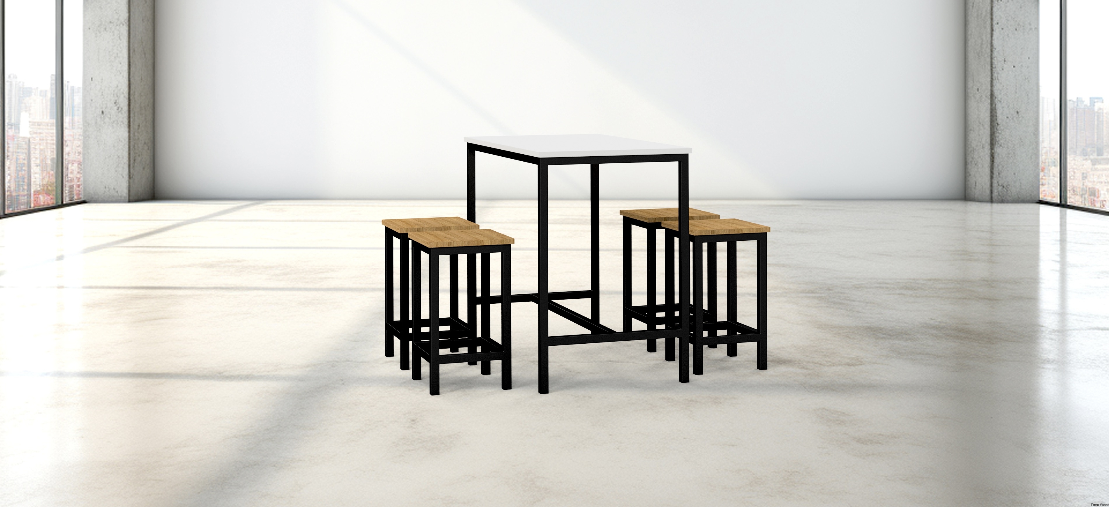 Blat stołu wykonany jest z płyty MDF pokrytej matowym lakierem.  Siedziska hokerów wykonane są z wysokiej jakości drewna dębowego lub jesionowego .