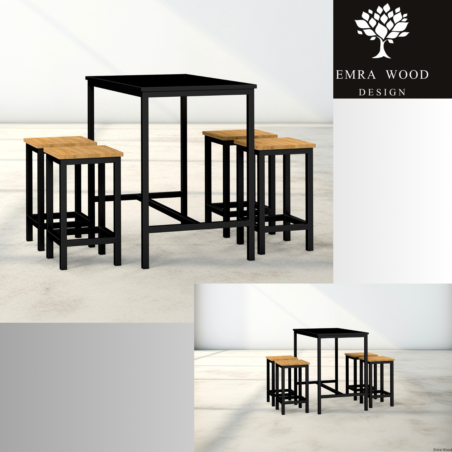 Zestaw jadalniany ZETS-5 składający się ze stołu barowego i czterech hokerów to idealne połączenie surowego designu z naturalnym pięknem drewna.