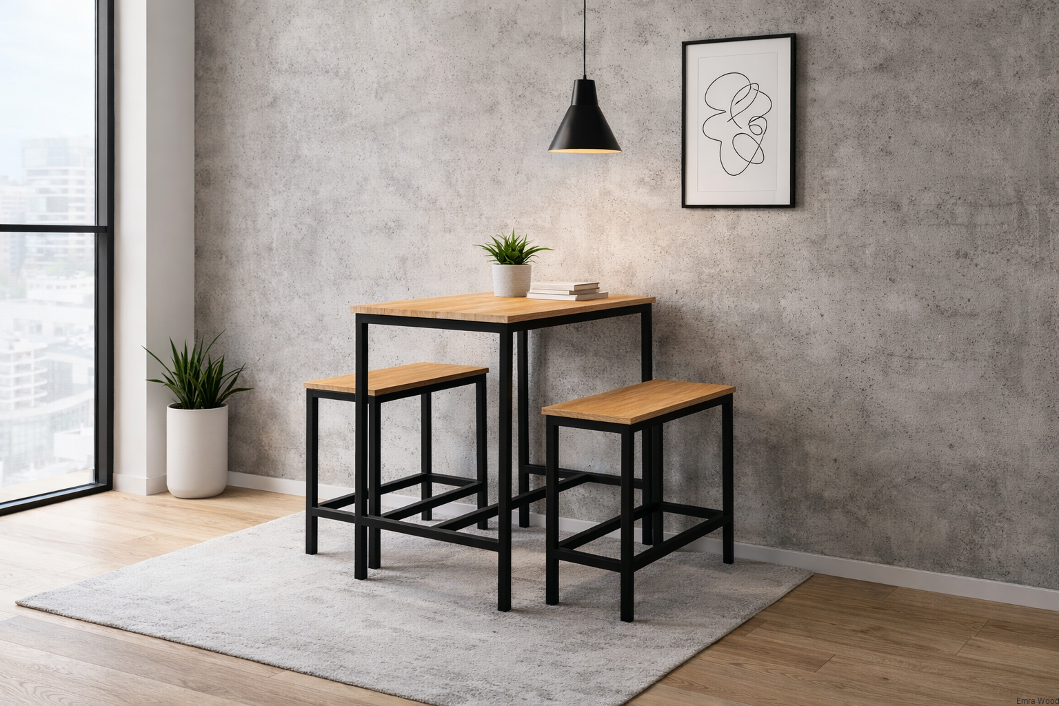 Zestaw Barowo -Jadalniany z Metalu i Drewna Litego Dębowego  Stół + 2 Taborety Model ZETS-24