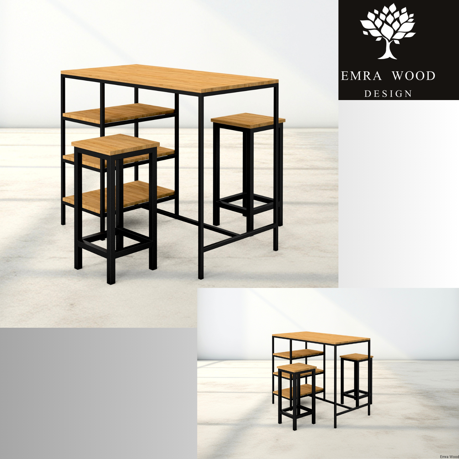 Zestaw Barowo -Jadalniany z Metalu i Drewna Litego Dębowego Stół + 2 Taborety Model ZETS-19