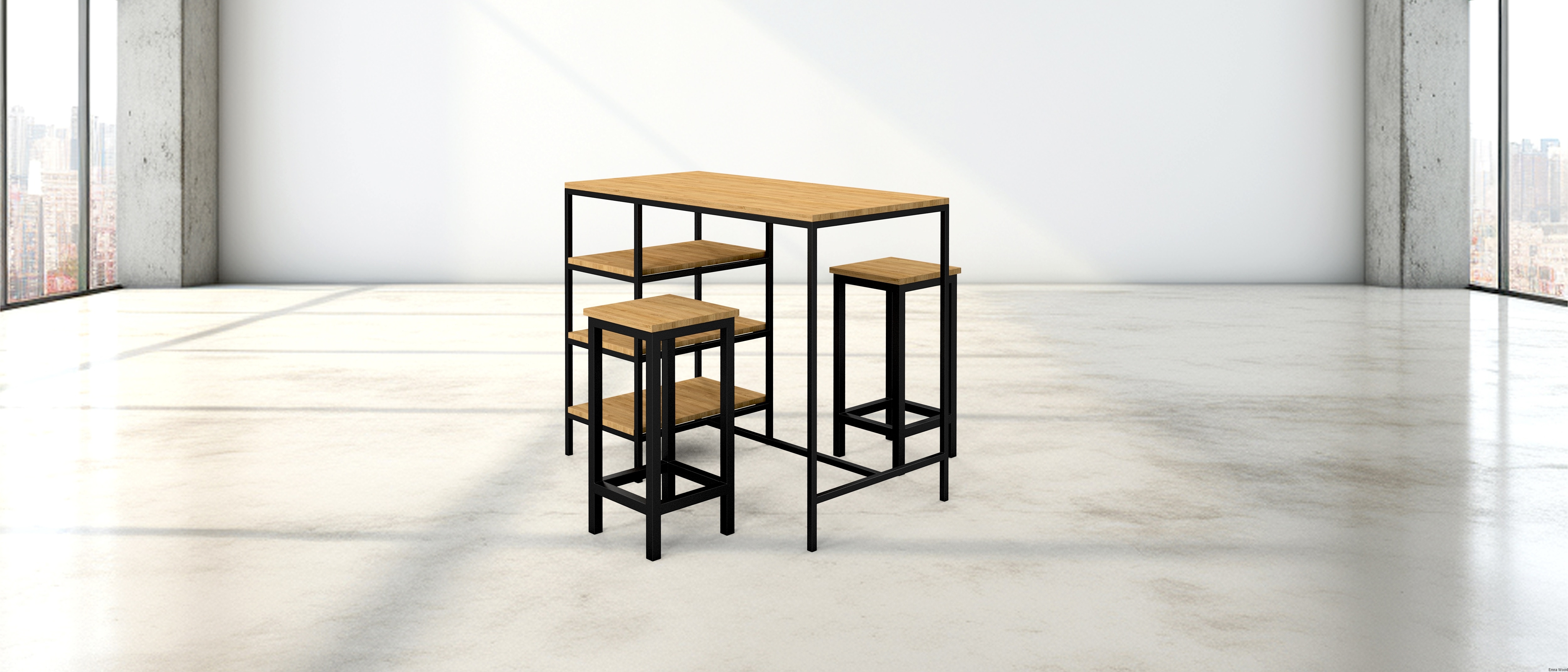 Zestaw Barowo -Jadalniany z Metalu i Drewna Litego Dębowego  Stół + 2 Taborety Model ZETS-19