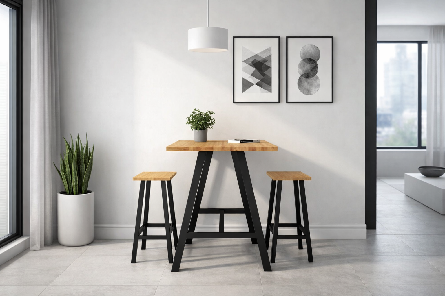 Zestaw Barowo -Jadalniany z Metalu i Drewna Litego Dębowego  Stół + 2 Taborety Model ZETS-24